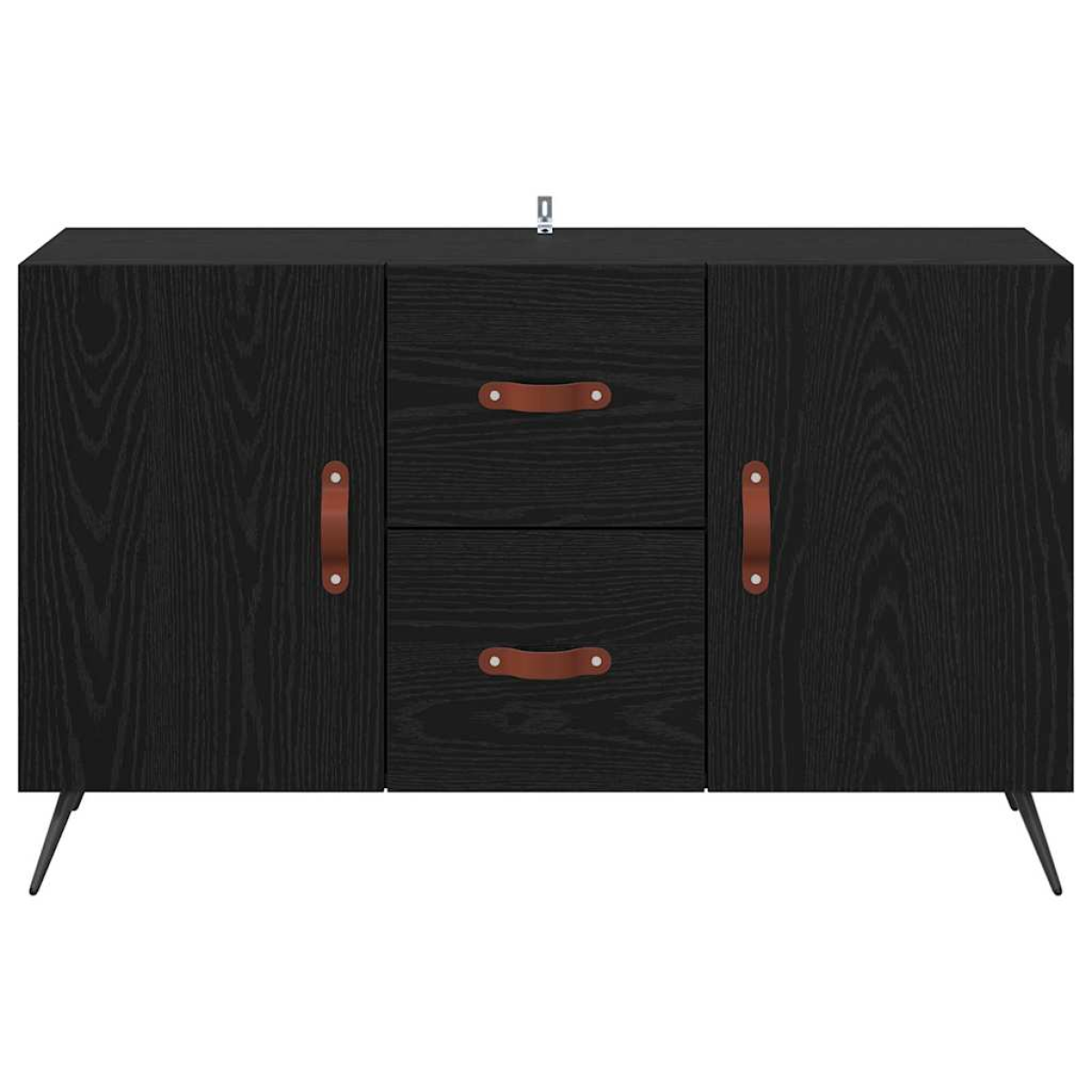 This sleek sideboard adds a touch of modern elegance to any room. With its clean lines and functional design, it offers both style and practicality, making it ideal for living areas or dining rooms. The rectangular shape and modern style make it versatile for various aesthetics, offering ample storage space without compromising on design. Perfect for enthusiasts of contemporary furniture, this sideboard seamlessly integrates into indoor spaces, exuding a sense of minimalistic charm. Engineered Wood Construction The sideboard features a durable engineered wood frame, ensuring a long-lasting and resilient structure. This material is selected for its resistance to abrasion and wear, making it suitable for everyday use. The sophisticated wood texture adds an elegant touch, enhancing the overall aesthetic of any room. Leather Pull Handles The sideboard is equipped with matte leather pull handles, providing a warm, textured feel. These pulls add a unique design element, offering easy access to stored items while complementing the modern style of the furniture. Metal Tapered Legs The elegantly designed tapered metal legs offer stability and a sleek appearance. The legs’ modern black finish aligns with the overall minimalist theme, adding a hint of sophistication while ensuring the sideboard stands firm on indoor surfaces. Hinge Door Mechanism The sturdy hinge doors make storing and retrieving items effortless. The hinge mechanism promotes a clean look, while the engineered wood construction on doors ensures consistency in design and quality. Board Shelves for Organization Equipped with board shelves made of engineered wood, the sideboard provides a straightforward organization solution. Ideal for storing a variety of items, the strong shelves offer convenience and accessible storage while maintaining a tidy appearance.