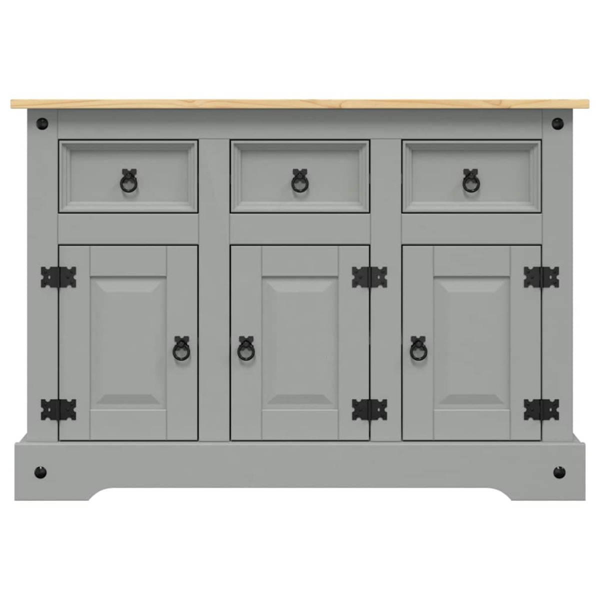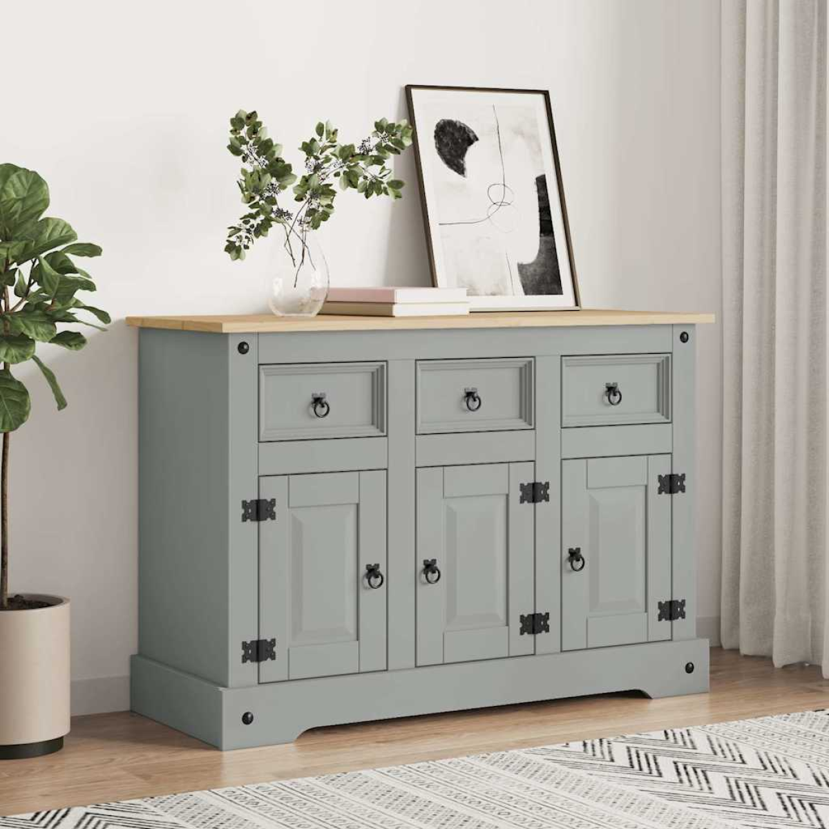 This practical wooden sideboard is designed to meet your storage needs and is an ideal complement to your living room. Solid pine wood: Solid pine wood is a beautiful natural material. Pine wood has a straight grain, and the knots give the material its signature, rustic look.Ample storage space: The storage cabinet with drawers provides ample space to keep your items dust free and well organised.Practical doors: Keep your space clutter-free by hiding small essentials behind the doors of the sideboard cabinet.Sturdy top: The sturdy top of the buffet is ideal for placing fruit baskets, photo frames, potted plants, and other decorative items. Warning:To prevent it being overturned, this product must be used with the provided wall attachment device.