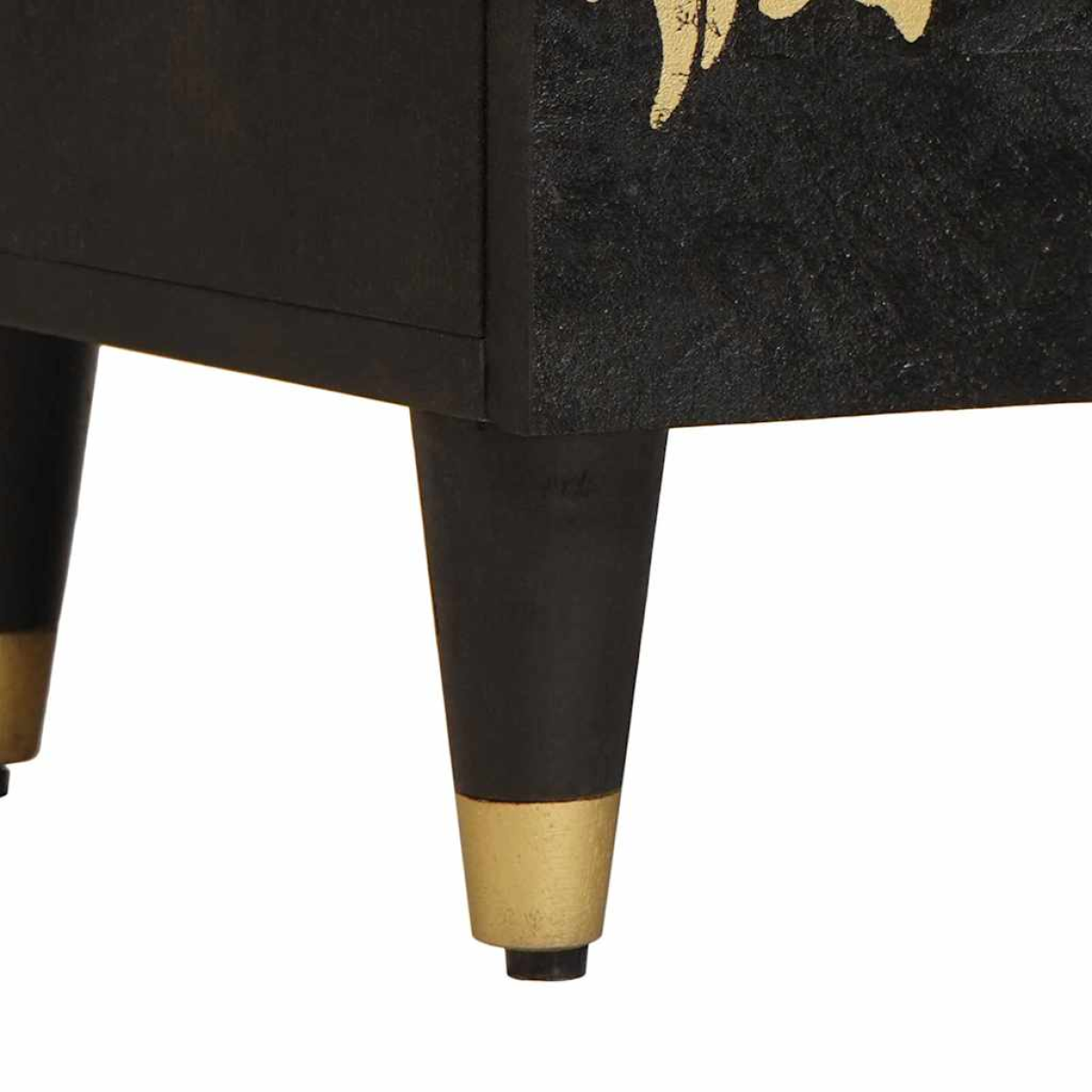 This sideboard offers a refined storage solution in modern living rooms or dining spaces. Its sophisticated design features a sleek rectangular shape, seamlessly blending with various interior styles. With its striking gold screen-printed design, this sideboard serves as both a functional and a decorative piece of furniture, providing ample storage in a visually appealing format. Materials: Constructed from solid mango wood, this sideboard promises robust longevity, with engineered wood elements enhancing stability and uniformity. The natural grains and textures of mango wood offer a unique charm that adds character to any room, making it a focal point coupled with durability. Included Components: Equipped with brass handles and legs that complement the gold screen-printed design on its surface, this sideboard combines functionality with artistic elements. The brass components ensure easy accessibility and enduring strength, contributing to its contemporary appeal. Features /Function /Design: Featuring a gold screen-printed pattern and elegant brass knobs, this sideboard embodies a modern style that emphasizes simplicity and clean lines, perfectly fitting into an aesthetically driven interior space. The combination of metal and wood creates a balanced appearance desirable in any setting. Recommended Uses: Ideal for living rooms or dining areas, this sideboard is perfect for housing dinnerware, table linens, and other essentials while maintaining an organized space. Its adaptable design allows it to blend into various themes, from casual gatherings to formal occasions. Care &Maintenance: To maintain its pristine condition, wipe with a dry cloth regularly, avoiding harsh chemicals that could harm its delicate design. This simple maintenance routine helps preserve its appearance, ensuring longevity and continuous enjoyment of its visual appeal.