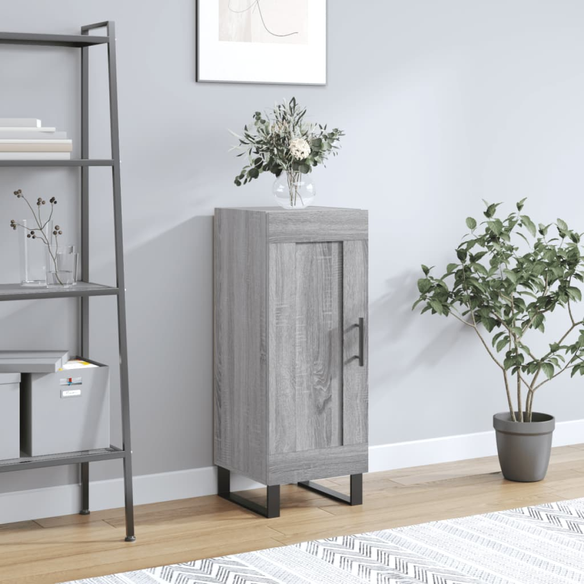 This trendy sideboard, featuring a timeless look, is meant to be an excellent addition to your home. Durable material: The engineered wood is of exceptional quality with smooth surface and also features strength, stability and resistance to moisture.Ample storage space: The sideboard cabinet has 3 compartments, providing ample storage space for keeping your various daily essentials well organised and within easy reach.Displaying function: The top of the cupboard is perfect for placing potted plants, framed photos and other decorative items.Practical door: Keep your essentials free from dust by hiding them behind the door. In addition, the handle on the door makes it easy to open the storage cabinet.Metal legs: The metal legs add a modern and calm style to your interior while ensuring stability. Warning:To prevent it being overturned, this product must be used with the provided wall attachment device.