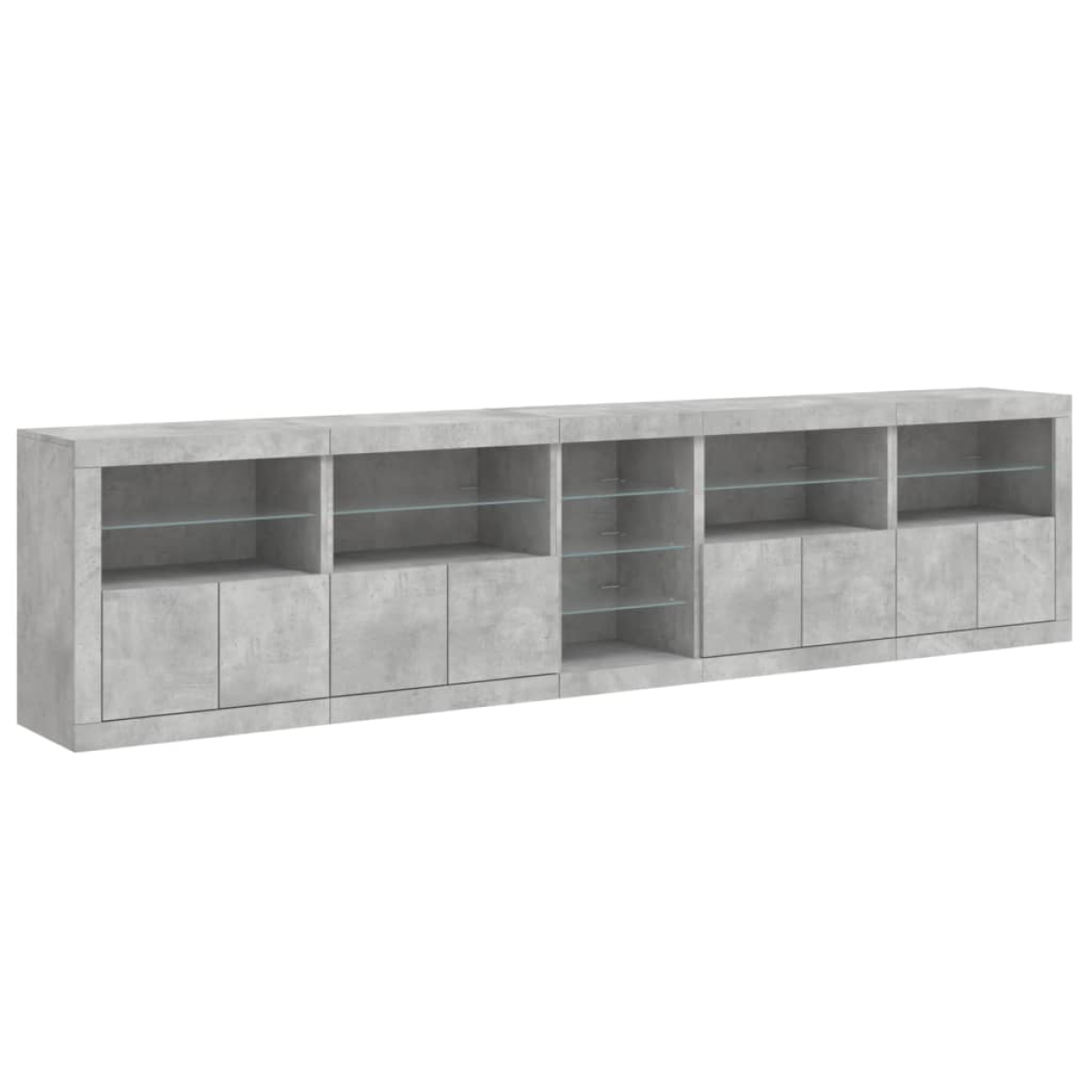 Decorate your room with this modern sideboard with LED lights, it easily blends with furniture in any style at your house. Durable material: The engineered wood is of exceptional quality with smooth surface and also features strength, stability and resistance to moisture.RGB LED lights: The buffet is equipped with vibrant RGB LED lights. With various customisable menus, you can effortlessly change the colour of the lights and even set them to adjust automatically. These LED lights not only enhance the contemporary look of the sideboard cabinet but also add to its trendy appeal.Ample storage space: The storage cabinet offers plenty of space to keep your everyday items neatly arranged and easily accessible.Displaying function: The sturdy top of the hallway cabinet is ideal for displaying decorative objects, photo frames, or potted plants.Practical doors: Keep your essentials free from dust by hiding them behind the doors of the side cabinet. Good to know:The product has a USB connector that requires a certified 5V USB power source (not included). Warning:To prevent it being overturned, this product must be used with the provided wall attachment device.