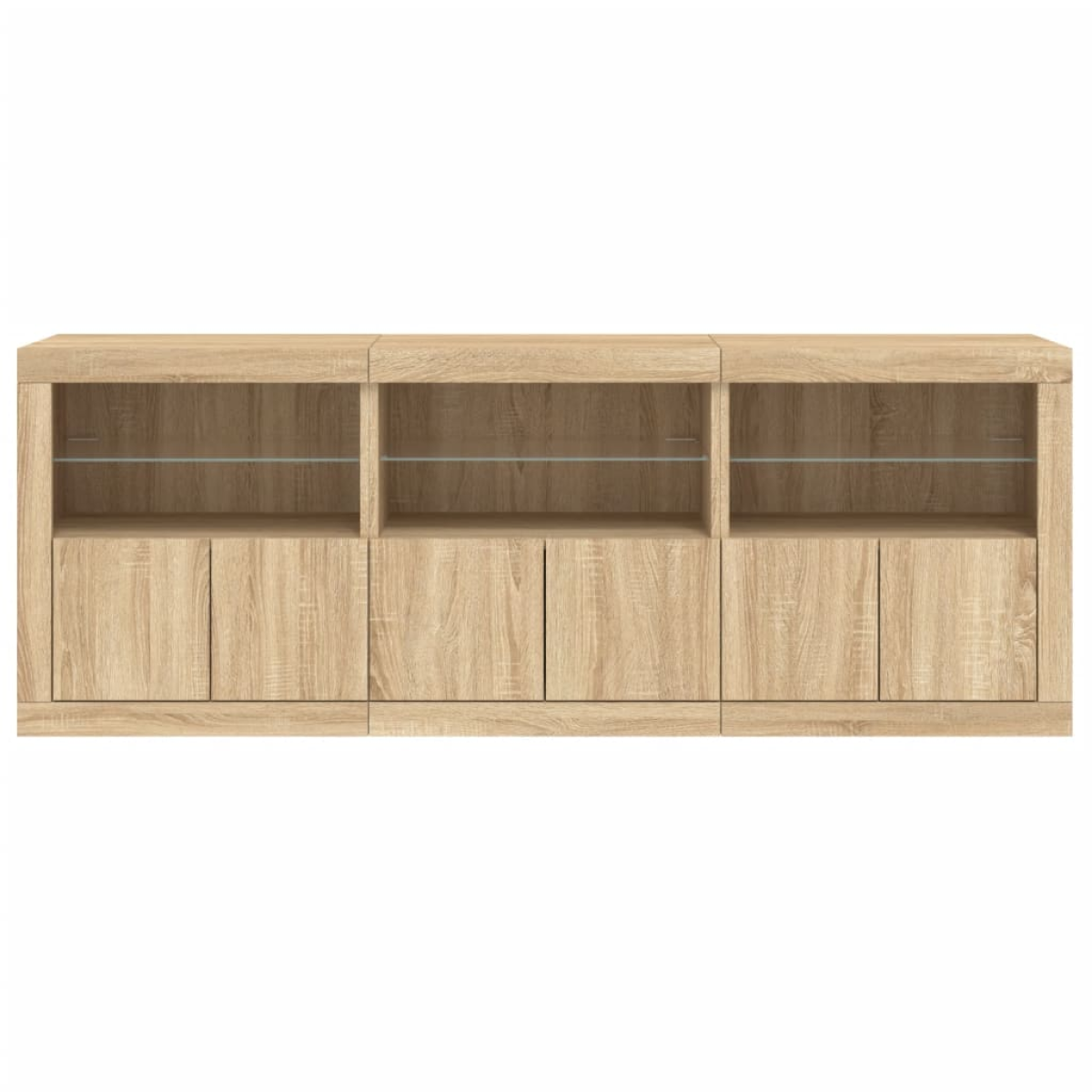 Decorate your room with this modern sideboard with LED lights, it easily blends with furniture in any style at your house. Durable material: The engineered wood is of exceptional quality with smooth surface and also features strength, stability and resistance to moisture.RGB LED lights: The buffet is equipped with vibrant RGB LED lights. With various customisable menus, you can effortlessly change the colour of the lights and even set them to adjust automatically. These LED lights not only enhance the contemporary look of the sideboard cabinet but also add to its trendy appeal.Ample storage space: The storage cabinet offers plenty of space to keep your everyday items neatly arranged and easily accessible.Displaying function: The sturdy top of the hallway cabinet is ideal for displaying decorative objects, photo frames, or potted plants.Practical doors: Keep your essentials free from dust by hiding them behind the doors of the side cabinet. Good to know:The product has a USB connector that requires a certified 5V USB power source (not included). Warning:To prevent it being overturned, this product must be used with the provided wall attachment device.