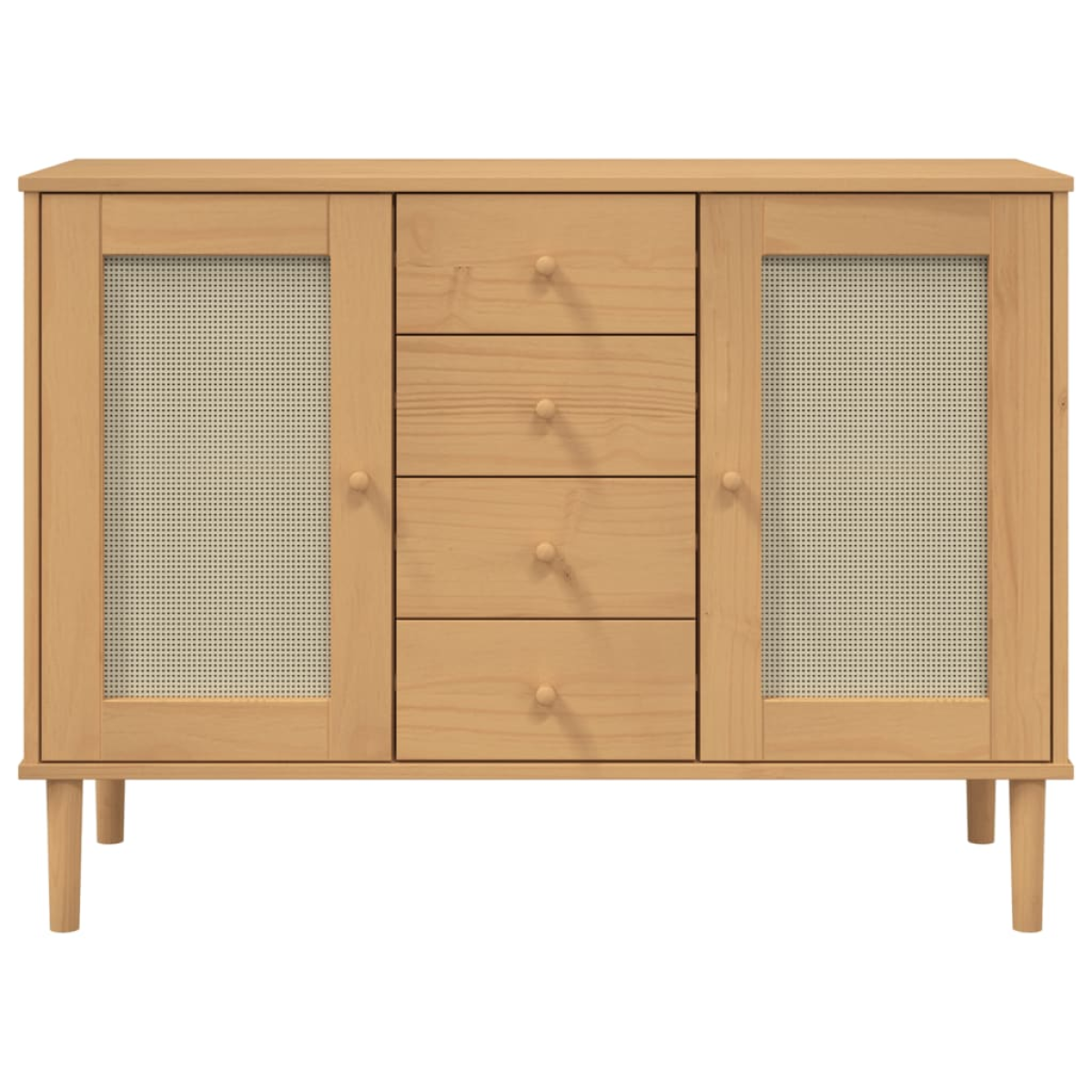 This wooden sideboard featuring a minimalist charm is designed to meet your storage requirements while adding a unique look to your room. Solid pine wood: Solid pine wood is a beautiful natural material. Pine wood has a straight grain, and the knots give the material its signature, rustic look.UV varnish: UV varnish is a special type of varnish that's finished using an ultraviolet drying machine. It creates a more vivid, more luxurious and more tactile finish when compared to non-UV varnishes.Ample storage space: This side cabinet has 4 drawers and 4 compartments, offering ample storage space for keeping your magazines, books, DVDs, multimedia devices and other essentials well organised and within reach.Rattan look surface: The storage cabinet's door surface is handcrafted from poly rattan, a two-tone blend of midcentury modern and boho that adds a cozy yet stylish touch to your space.Sturdy top: The sturdy top is perfect for placing potted plants, framed photos and other decorative items. Warning:To prevent it being overturned, this product must be used with the provided wall attachment device.