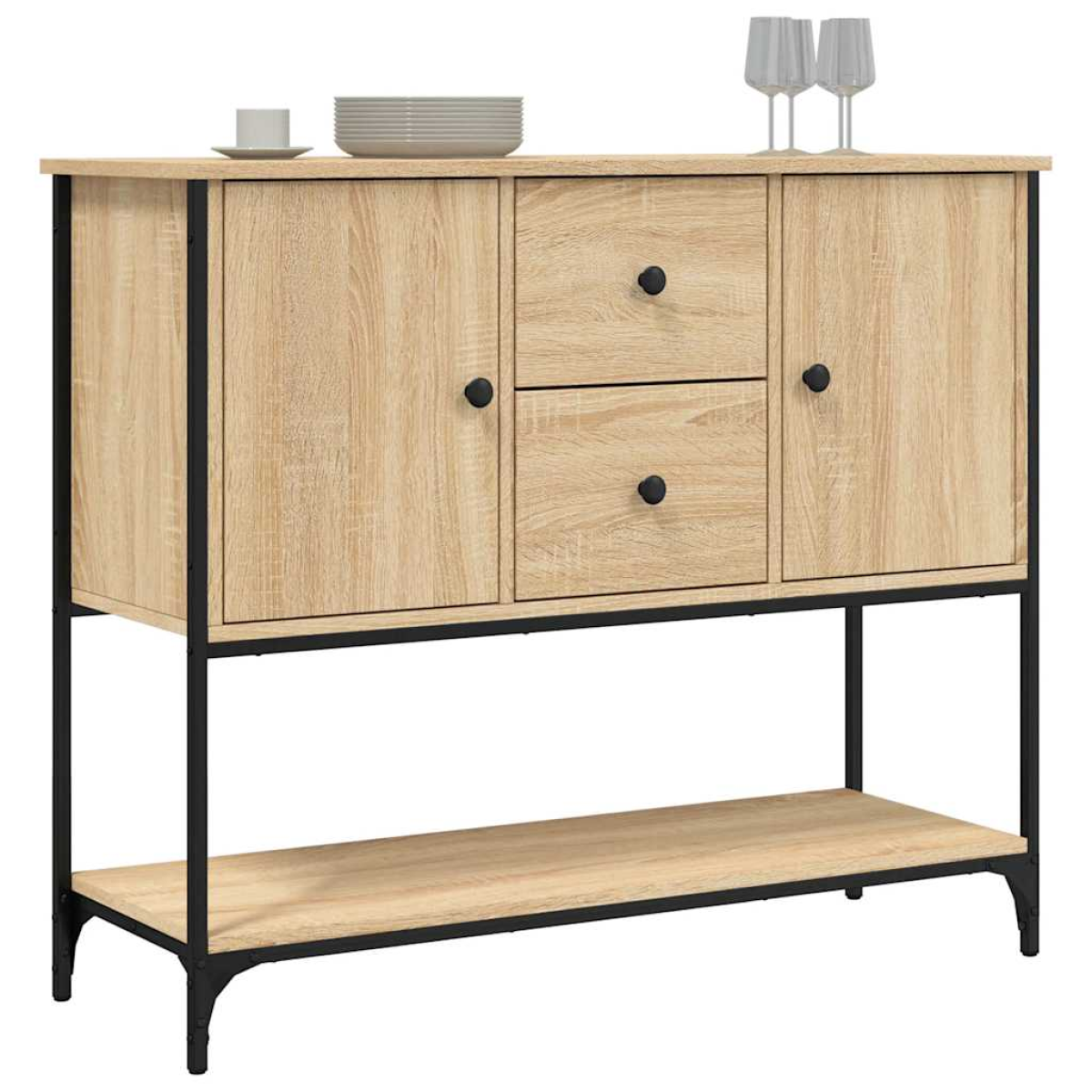 This classic sideboard, featuring a timeless look, is meant to be an excellent addition to your home. Durable material: The engineered wood is of exceptional quality with smooth surface and also features strength, stability and resistance to moisture. Made of engineered wood, the sideboard cabinet is easy to clean with a damp cloth.Ample storage space: The storage cabinet offers ample storage space for keeping your various daily essentials well organised and within easy reach.Displaying function: The top of the side cabinet is great for displaying your decorative items, photo albums or small plants.Adjustable feet: Four adjustable feet with plastic pads keep the storage furniture balanced on uneven ground and increase stability. Warning:To prevent it being overturned, this product must be used with the provided wall attachment device.