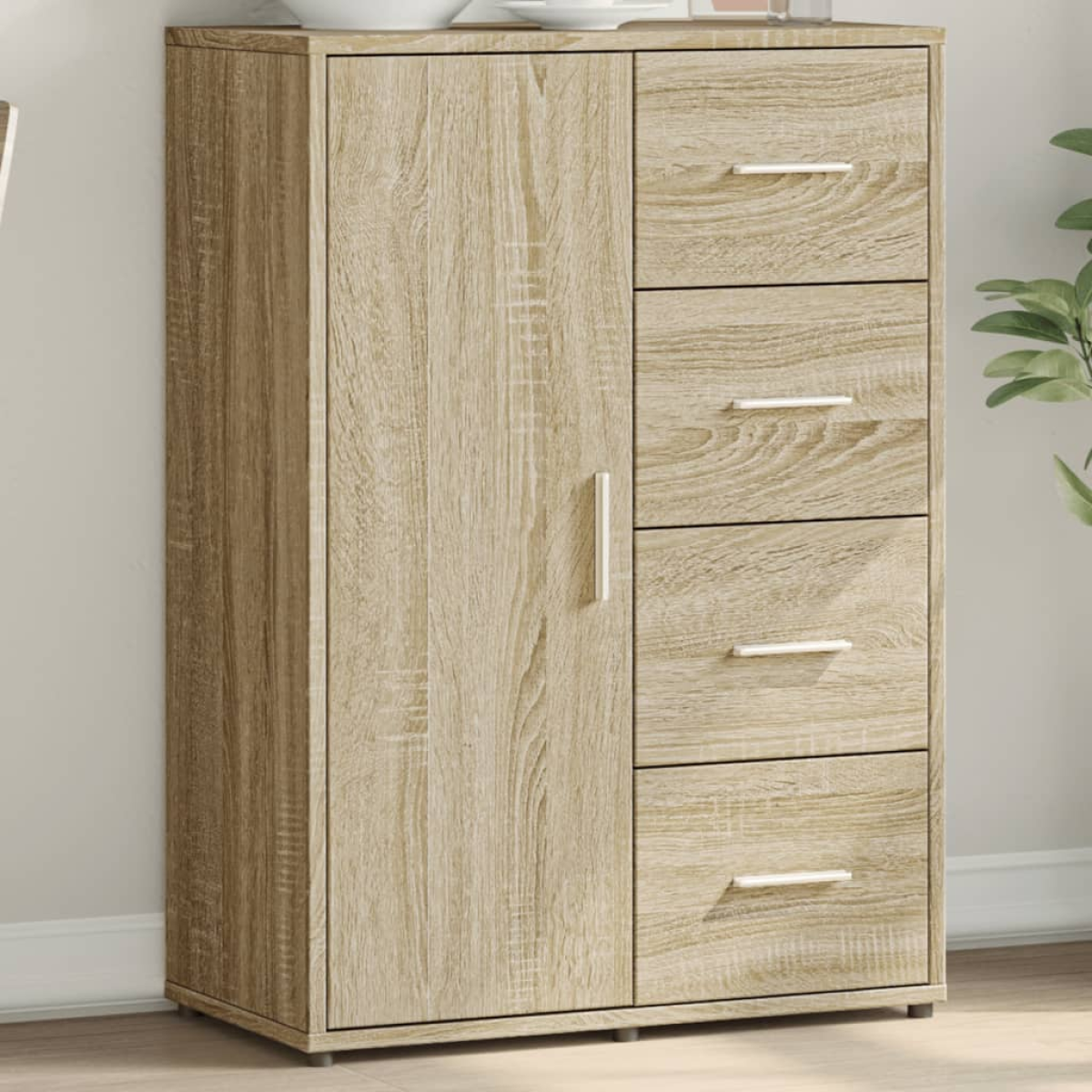 This sturdy sideboard is designed to be a focal point of your room with a trendy yet practical design. Durable material: The engineered wood is of exceptional quality with smooth surface and also features strength, stability and resistance to moisture. Made of engineered wood, the storage cabinet is easy to clean with a damp cloth.Ample storage space: This sideboard offers handy storage space for keeping your magazines, books, remote controls and other small items well-organised and within reach.Wide application: This sideboard's top provides more space for placing items, suitable for mobile phones, books, lamps, etc. Warning:To prevent it from tipping over, this product must be used with the wall attachment device (not provided).