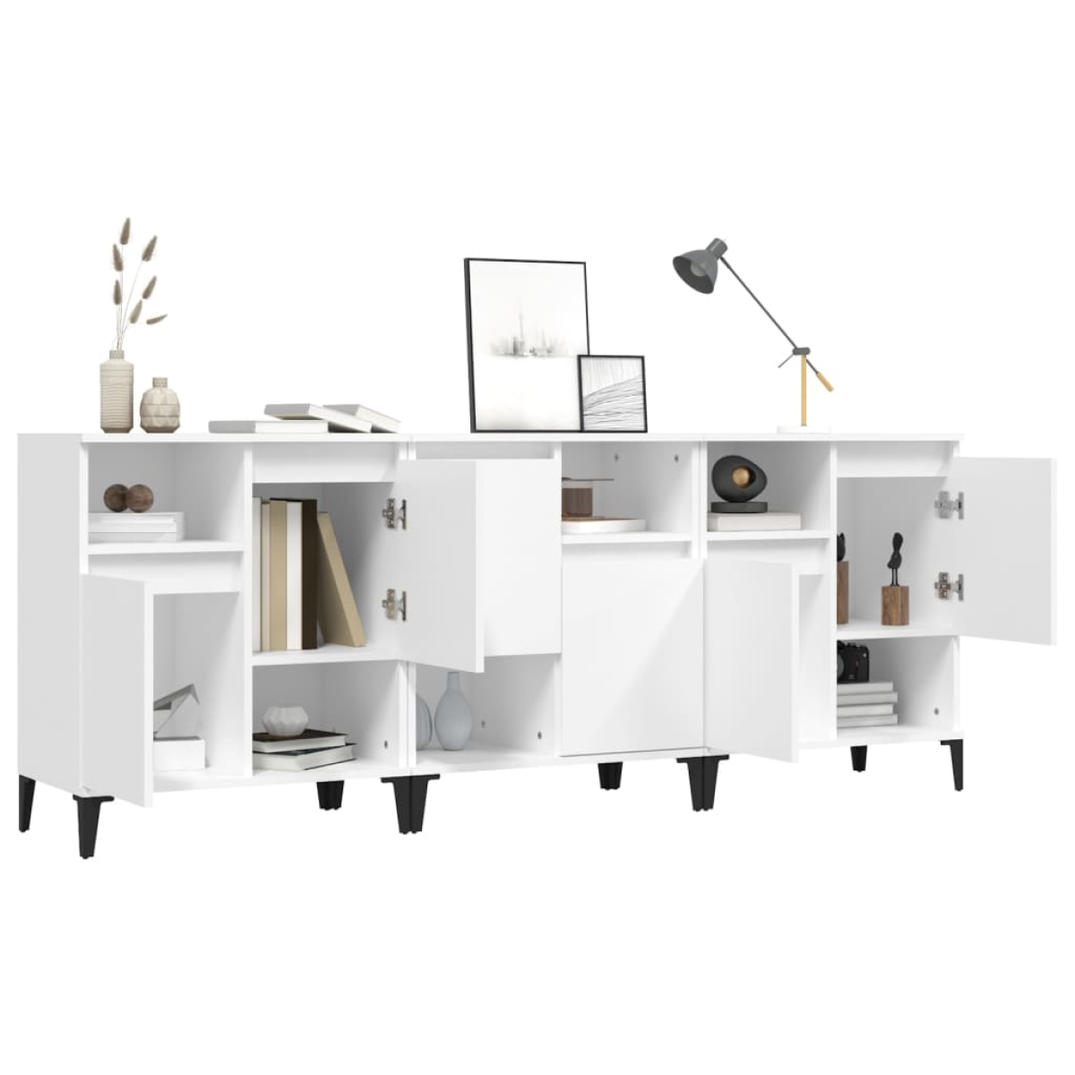 These classic sideboards, featuring a timeless look, are meant to be an excellent addition to your home. Durable material: The engineered wood is of exceptional quality with smooth surface and also features strength, stability and resistance to moisture. Made of engineered wood, the cabinet is easy to clean with a damp cloth.Ample storage space: Equipped with 4 compartments, the sideboard cabinet offers ample storage space for keeping your various daily essentials well organised and within easy reach.Displaying function: The top of the cupboard is great for displaying your decorative items, photo albums or small plants. Good to know:The doors can be installed in two ways. Warning:To prevent it being overturned, this product must be used with the provided wall attachment device.