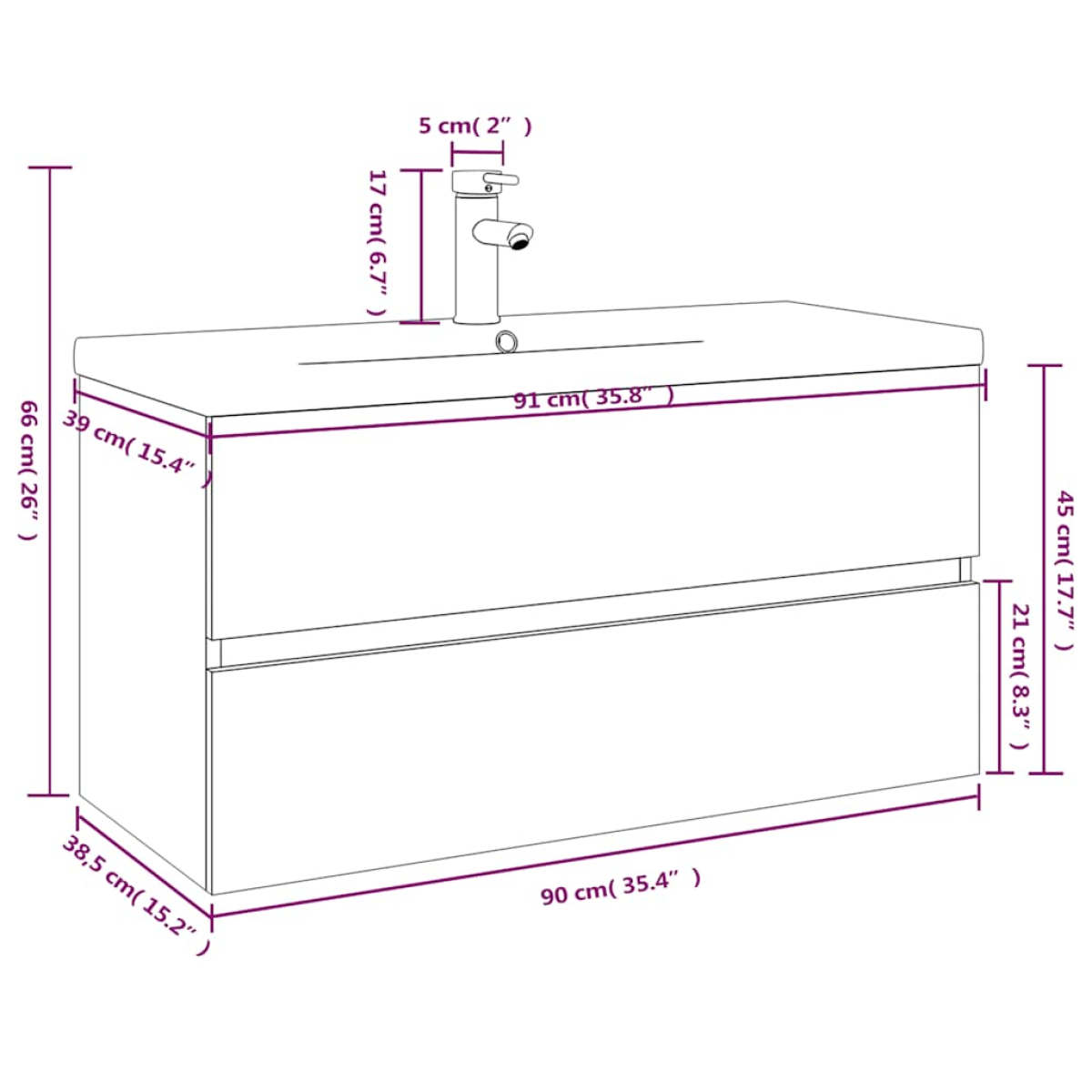 This stylish sink cabinet with a built-in basin, featuring spacious storage space, is an excellent addition to your bathroom, giving it a tidy and striking appearance! Sturdy material: The under sink cabinet is made of engineered wood, that is of exceptional quality with smooth surface and also features strength, stability and resistance to moisture.Ample storage: The bathroom sink unit features a drawer, offering ample storage space to store items in your bathroom.Practical design: The top of this bathroom cabinet is ideal for placing the sink.Wall-mounted function: The bathroom cabinet can be wall-mounted to add extra storage space. That way, you can maximise your floor space and keep the area clean.Overflow function: An overflow is also equipped to flow water out when it gets too full. Note:Screw(s) and plug(s) for inside the wall are not included. Seek and use screw(s) and plug(s) suitable for your walls. If you are uncertain, seek professional advice. Read and follow each step of the instruction carefully.The tap and the drain are not included in delivery.Each product comes with an assembly manual in the box for easy assembly.The tap is a hot and cold tap, and if you have a need for hot water, a water heater must be connected.