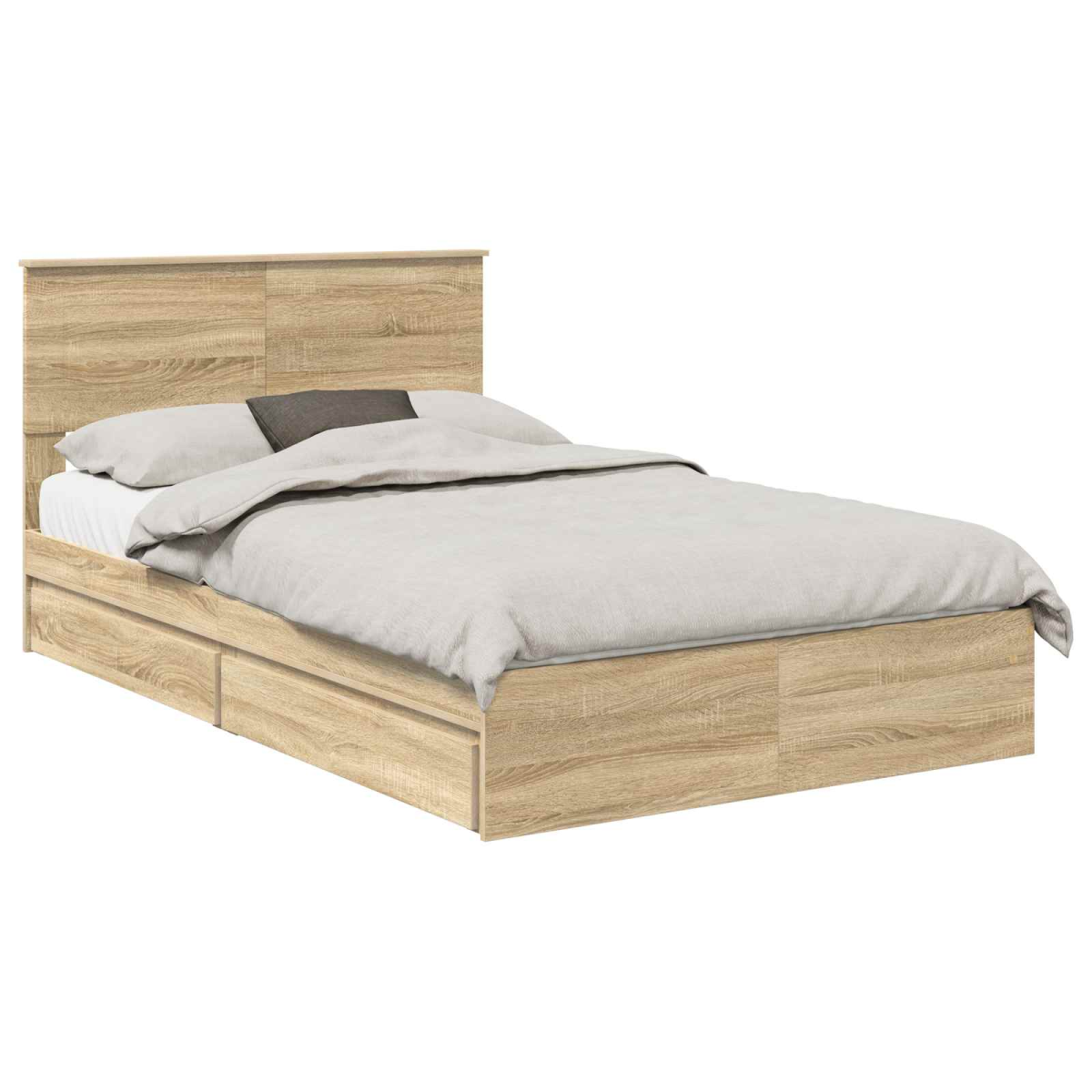 This modern storage bed frame is a fusion of style and functionality, designed to enhance a contemporary bedroom environment. With its minimalist design and clean lines, it brings a touch of modern elegance to your personal space. Perfect for those who appreciate beauty in simplicity, the bed frame offers not just a sleeping space but also an opportunity to stay organized with its convenient storage features. Crafted from durable engineered wood, it promises robustness while maintaining a sleek and non-intrusive appearance—an essential for the modern homeowner galavanting between lush slumber and pragmatic functionality. Material Qualities: The bed is constructed from high-grade engineered wood, known for its resilience and stability. This choice of material ensures that the frame can withstand the test of time, providing a reliable foundation for any mattress. Its engineered nature means it's less prone to warping or cracking, making it an excellent choice for long-term use. Smart Storage: Equipped with traditional drawers featuring handle pulls, this storage bed allows for easy organization of bedroom essentials. The drawers, also made from engineered wood, seamlessly blend into the bed's design, creating a cohesive look and providing ample space for linens, clothes, or other personal items. Sleek Design: Boasting a modern aesthetic characterized by clean lines and minimal ornamentation, this bed frame complements contemporary interiors. Its rectangular shape and understated finish make it versatile enough to coordinate with various room designs and styles, from minimalist to urban chic. Intuitive Assembly: Designed with user convenience in mind, the assembly process requires only a screwdriver and can be completed by two people. The clear assembly instructions aim to make setting up your new bed an uncomplicated process, helping you to quickly transition your bedroom into a functional space. Simple Care Guidelines: Maintaining the appearance of this bed is straightforward. Simply wipe down the surface with a damp cloth to remove dust and keep it looking fresh. Avoiding harsh chemicals ensures not only that the bed's finish remains intact but also that it remains safe for household use over the years.