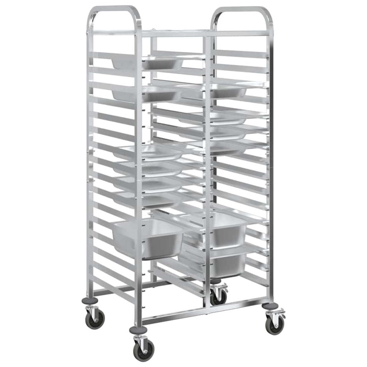 Enhance your kitchen efficiency with the tray trolley, designed for durability and flexible movement. Durable construction: Crafted from stainless steel, the tray trolley guarantees long-lasting performance and corrosion resistance, making it easy to clean and ideal for a variety of occasions.Generous tray capacity: Featuring multiple tray slots, the trolley provides efficient storage and transport solutions. It accommodates up to 32 GN 1/1 containers with a maximum depth of 65 mm and is versatile enough to hold GN 1/2, 1/3, 2/3, and 2/8 sizes. Please note that if deeper containers are used, fewer containers can be stored.Flexible and stable mobility: Featuring four silent rotating castors, including two with locking brakes, the trolley glides effortlessly across various surfaces. The brakes ensure added stability, keeping it securely in place when needed.Space-saving design: The compact and ergonomic design maximises storage efficiency without compromising on mobility, making the trolley perfect for tight spaces in kitchens, catering setups, or food service environments.Easy to clean: The trolley’s smooth stainless-steel surface facilitates quick and easy cleaning. A simple wipe with a damp cloth or mild cleaner removes spills or stains, making it ideal for busy kitchens and food service areas. Good to know:The trays are not included in the delivery.If the GN containers are deeper, fewer containers should be placed in the tray trolley.
