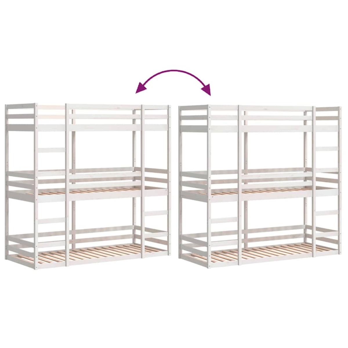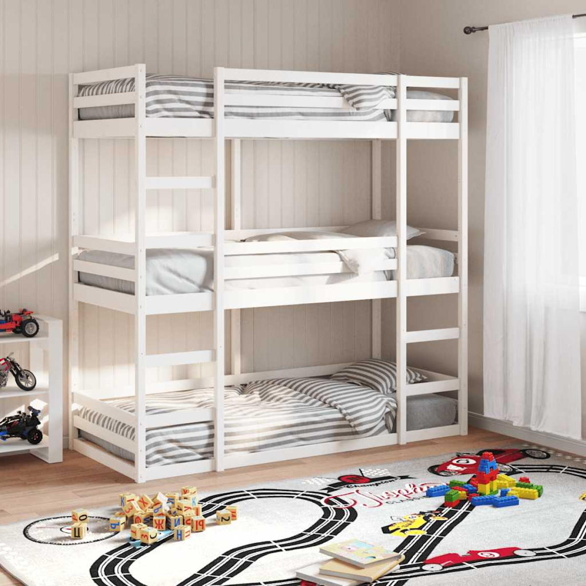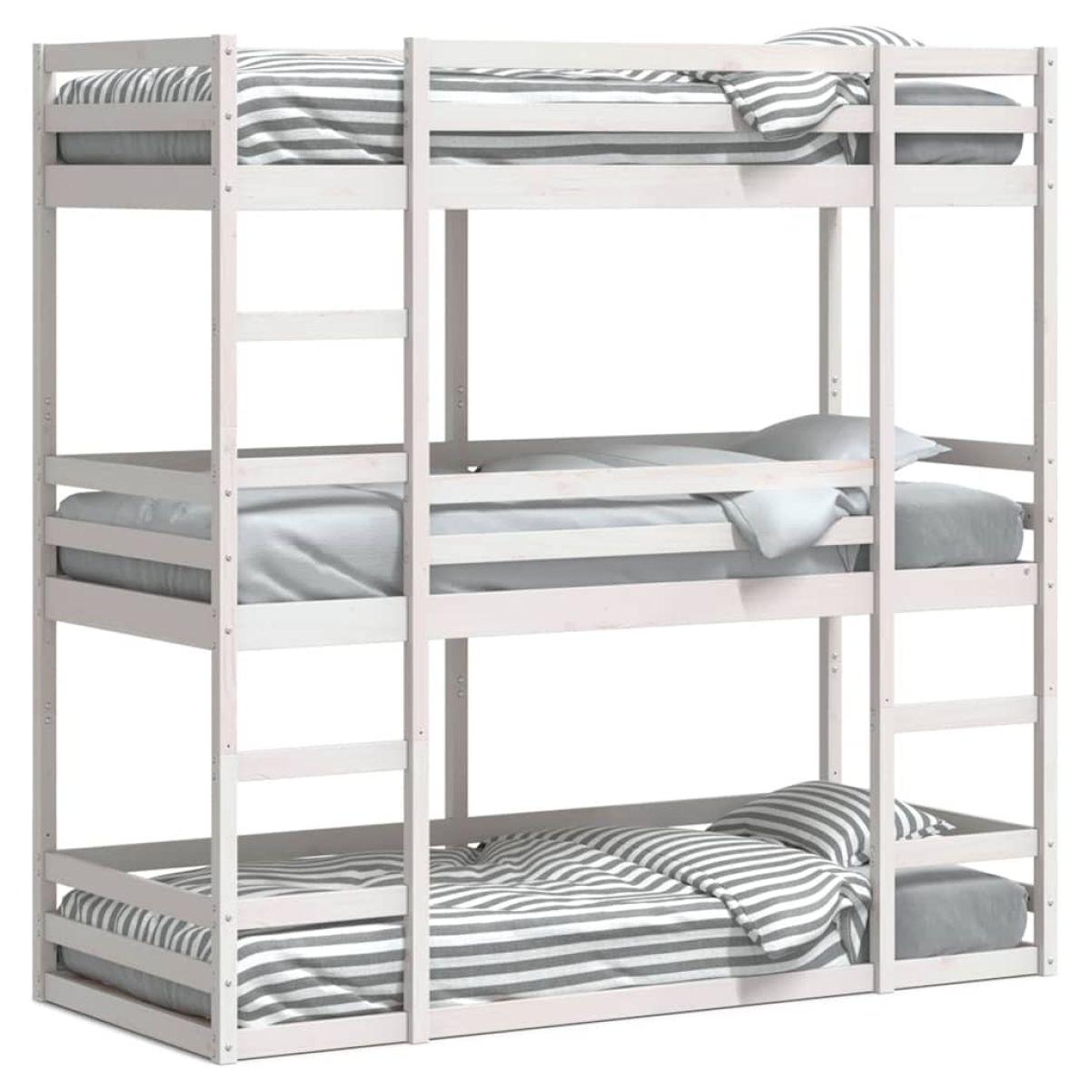 This wooden triple bunk bed is elegant and functional, making it a perfect addition to any room with limited space. Robust and stable: Solid pinewood is known for its strength and durability. Its straight grains and distinctive knots contribute to its rustic charm.Safety guardrails: The triple sleeper comes with safety guardrails on all 4 sides, so you can sleep without worrying about falling off.Practical ladder: The ladder of this bunk bed makes sleeping on the upper floor easier and safer and offers you sufficient safety and stability.Full use of space: This triple sleeper bunk bed uses vertical space efficiently and can be easily converted into separate single and platform beds. Perfect for multi-headed families or spontaneous overnight guests, this triple bed meets versatile sleeping needs. Good to know:The delivery includes bed frames only. The mattresses are not included. You can check our shop for matching mattresses.Screws and plugs for inside the wall are not included. We advise to find and use screws and plugs suitable specifically for your walls. If you're not sure, you can consult with a professional. Please read and follow each step of the instructions.