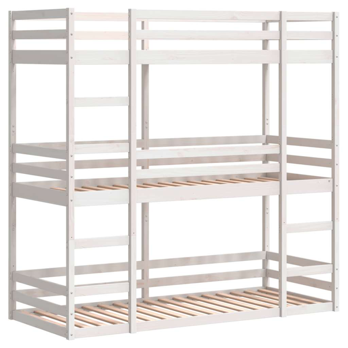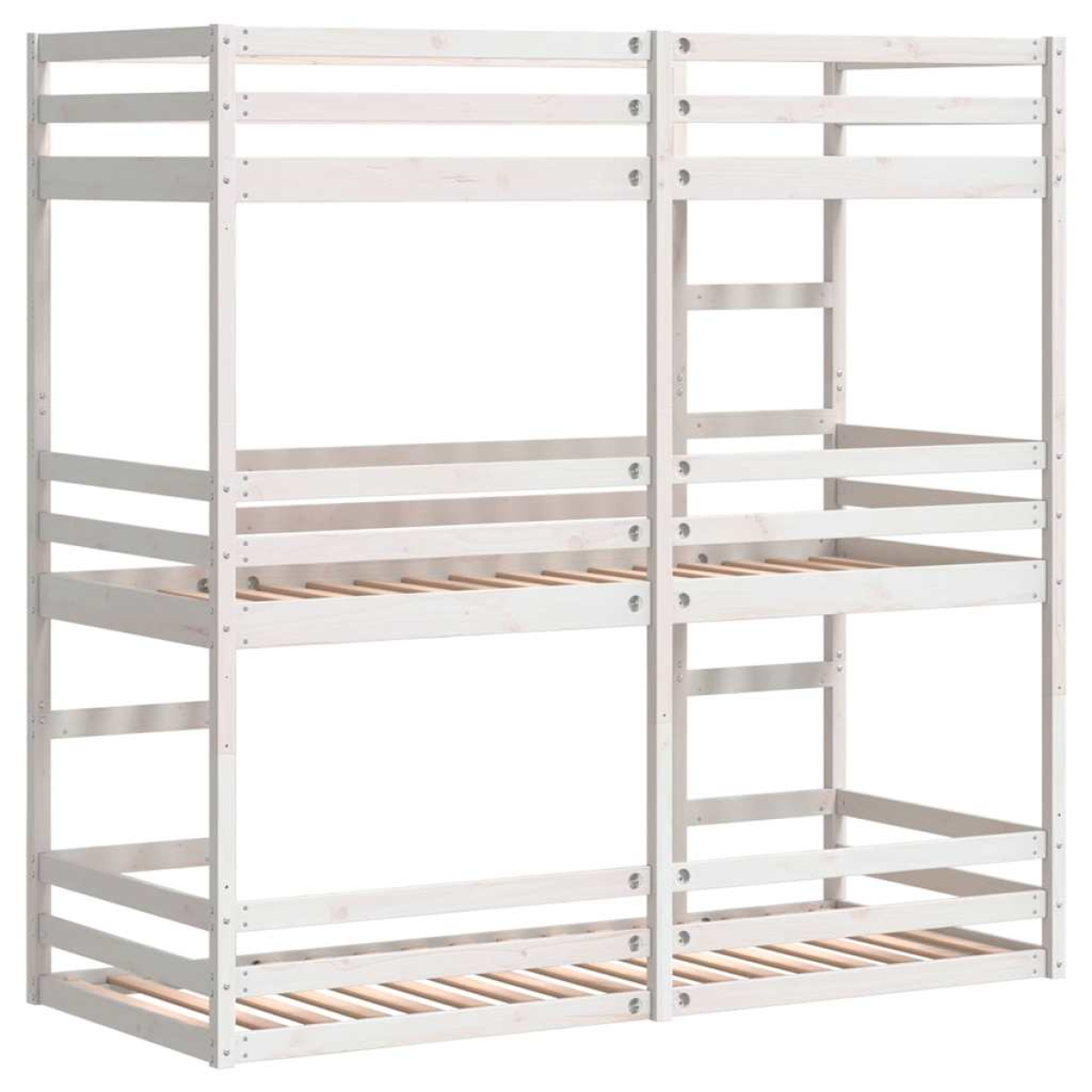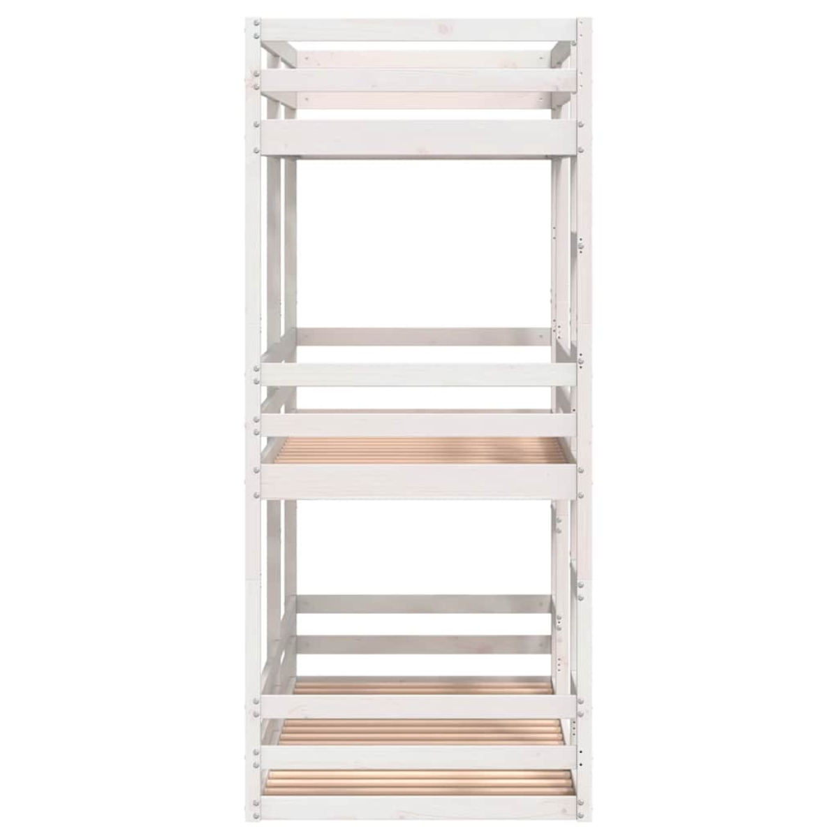 This wooden triple bunk bed is elegant and functional, making it a perfect addition to any room with limited space. Robust and stable: Solid pinewood is known for its strength and durability. Its straight grains and distinctive knots contribute to its rustic charm.Safety guardrails: The triple sleeper comes with safety guardrails on all 4 sides, so you can sleep without worrying about falling off.Practical ladder: The ladder of this bunk bed makes sleeping on the upper floor easier and safer and offers you sufficient safety and stability.Full use of space: This triple sleeper bunk bed uses vertical space efficiently and can be easily converted into separate single and platform beds. Perfect for multi-headed families or spontaneous overnight guests, this triple bed meets versatile sleeping needs. Good to know:The delivery includes bed frames only. The mattresses are not included. You can check our shop for matching mattresses.Screws and plugs for inside the wall are not included. We advise to find and use screws and plugs suitable specifically for your walls. If you're not sure, you can consult with a professional. Please read and follow each step of the instructions.