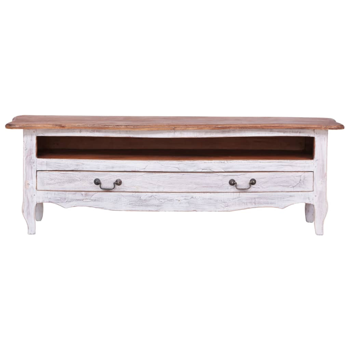 Introduce an air of rustic touch into your interior decor with our wooden TV cabinet! Made of solid mahogany wood, this solid wood TV shelf is exceedingly durable and sturdy. Mahogany is a tropical hardwood, standing out with its beauty, durability and color. Special craftsmanship has been used to give this item a vintage,warm and authentic look. The craftsmanship and the aesthetically appealing hardwood grains make each piece of our TV chest slightly different from the next. Featuring 1 big drawer and 1 open compartment, the distinctive stereo rack helps you to maintain your items in great order. The item is already assembled; no assembly is required. Important note: The wood grains and colours may vary from piece to piece, making each of our stereo cabinet unique. The delivery is random, ensuring the exclusivity and individuality of your product.