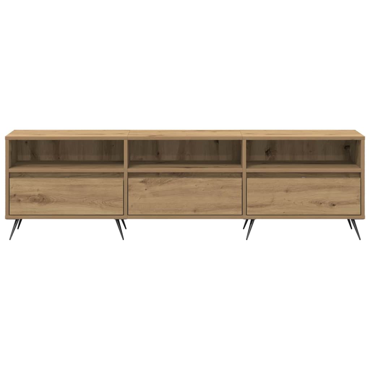 This modern rectangular TV cabinet serves as a stylish and functional centerpiece for your living room. With its sleek, minimalistic design, it provides the perfect blend of aesthetics and practicality, offering ample storage for media devices, entertainment accessories, and more. Its versatile shape complements various interior designs, making it a valuable addition to any contemporary household setting. Material Choice: Crafted from engineered wood, this cabinet promises a stable, enduring structure with an appealing natural texture. Its resilient build ensures a suitable surface for televisions and accompanying media equipment, easily blending with diverse living room themes. Efficient Storage: This cabinet features board shelves designed to organize media essentials tidily. The shelves are suitable for placing decorations or electronic devices, keeping surfaces clear and organized for optimal room aesthetics. Stylish Aesthetic: Exuding a modern flair, the cabinet's tapered black steel legs add a touch of elegance while offering sturdy support. This design enhances both the functionality and appearance, aligning with those who seek minimalist interior solutions. Versatile Use: Positioned as a versatile storage solution, this TV cabinet is ideal for various entertainment setups, from gamers to movie enthusiasts. It adeptly handles multiple uses while enhancing any living room environment. Assembly Requirements: Delivered flat-packed for easier transportation, this cabinet requires simple assembly for completion. Using a screwdriver, a single person can seamlessly construct this piece of furniture following the provided instructions.