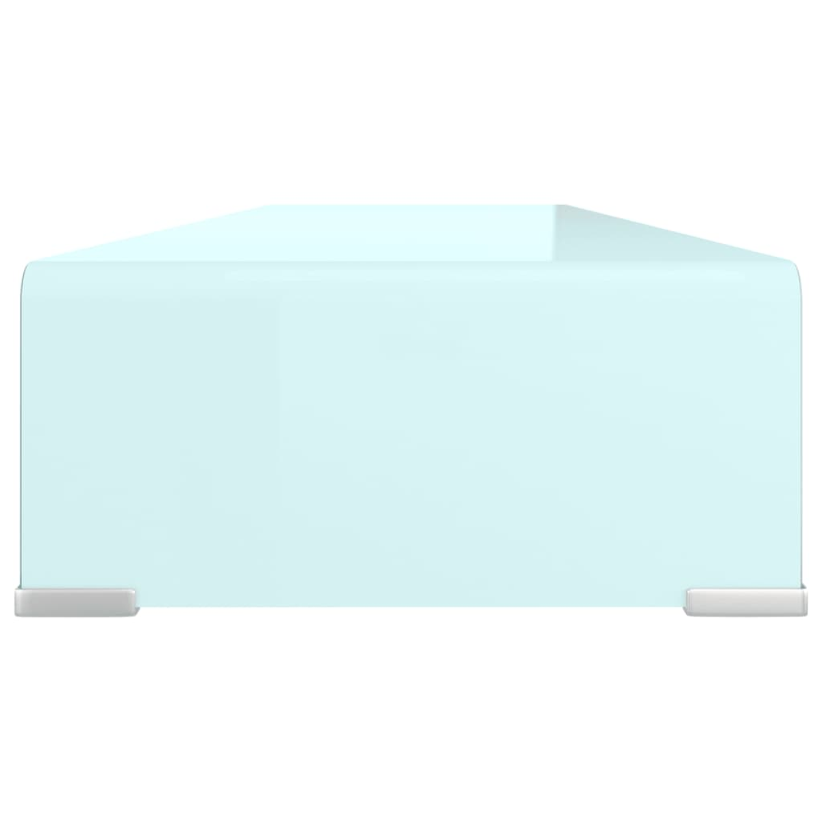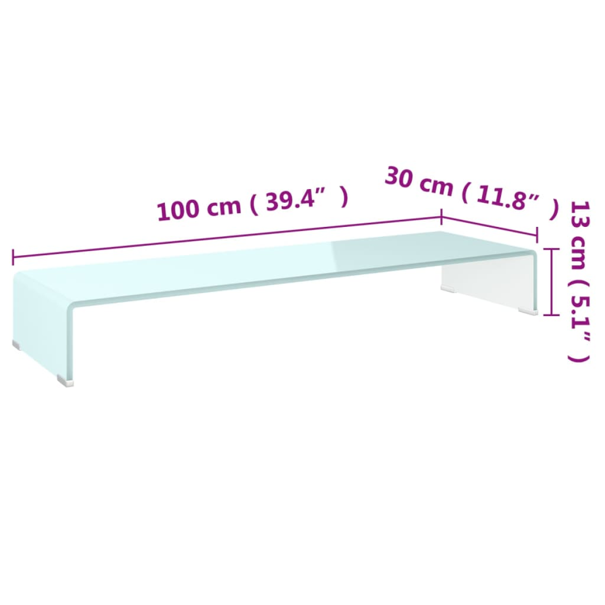 This practical TV stand has a tempered glass construction. The sleek, streamlined design of this understated TV unit will add a modern touch to your living space. This glass shelf can be used as a TV stand or riser for your desktop monitor, television, laptop and other multimedia devices. With the glass shelf raising the monitor, you will have a better view of the screen while sitting comfortably, which helps to reduce the strain and discomfort on your neck or back. The space underneath can accommodate your DVD player, game console, streaming device, receivers, and media carriers. The glass frame is tempered for added strength and safety. The smooth surface is easy to clean with only a damp cloth.