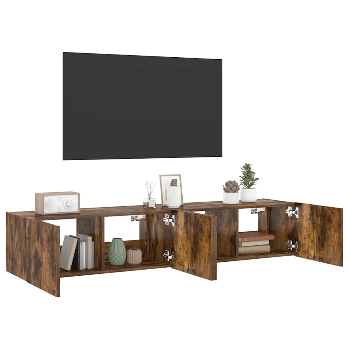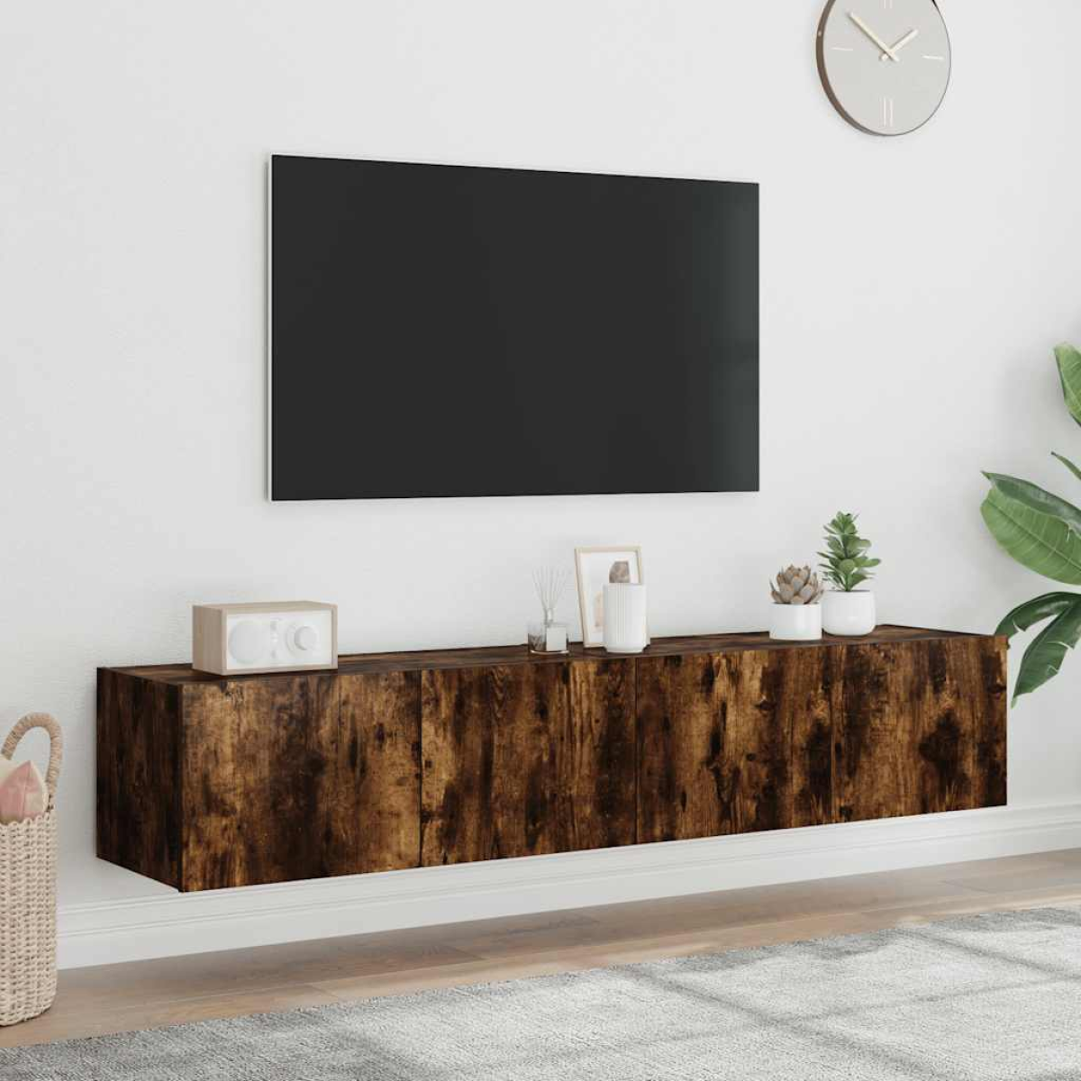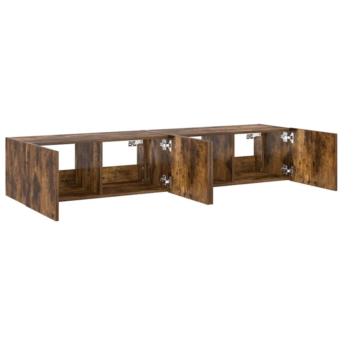 These TV wall cabinets are the perfect solution for your living space to maximise space and keep the floor areas uncluttered. Durable material: The engineered wood is of exceptional quality with a smooth surface and also features strength, stability and resistance to moisture.RGB LED lights: The wall media cabinet is equipped with vibrant RGB LED lights. With various customisable menus, you can effortlessly change the colour of the lights and even set them to adjust automatically. These LED lights not only enhance the contemporary look of the floating TV unit but also add to its trendy appeal.Ample storage space: The TV wall unit has 2 compartments behind the doors that offer ample space to keep your small items like books, DVDs, and magazines neatly organized and within reach.Versatile: The cabinet is multifunctional and can be used as a TV wall cabinet or a wall-mounted bedside cabinet. You can also combine it with other cabinets to create a stunning living wall.Wall-mounted design: This LED cabinet can be wall-mounted to add extra storage space. That way, you can maximise your floor space and keep the area clean. Good to know:Screws and plugs for inside the wall are not included. We advise to find and use screws and plugs suitable specifically for your walls. If you're not sure, you can consult with a professional. Please read and follow each step of the instructions.The product has a USB connector that requires a certified 5V USB power source (not included).