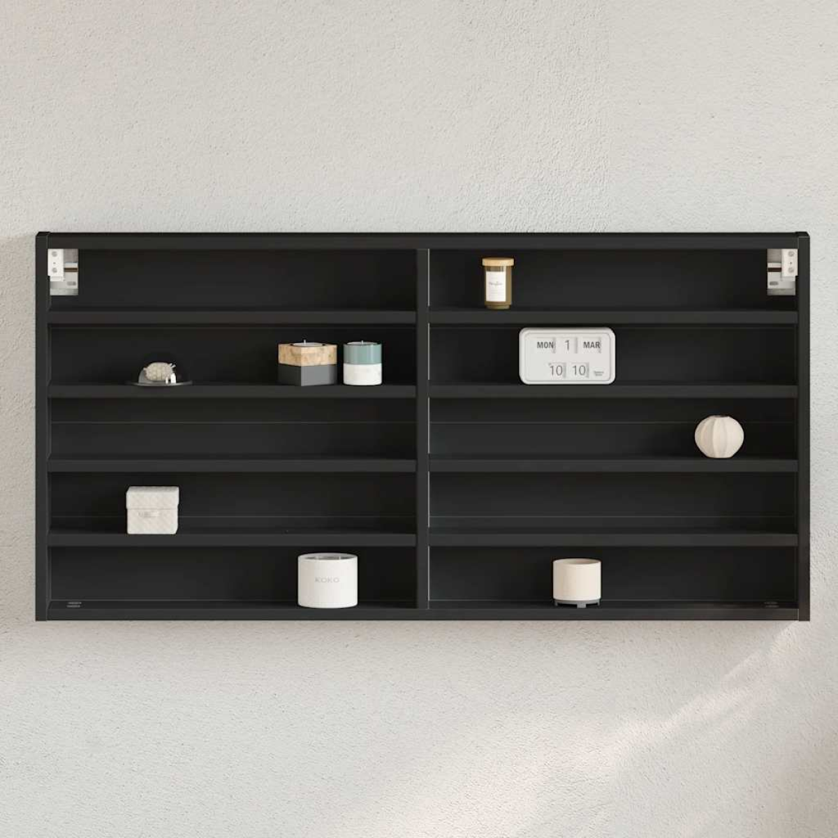 This trendy vitrine cabinet, featuring a sleek and classic design, is meant to be a decorative as well as practical addition to your existing home decor. Long-lasting material: The engineered wood is of exceptional quality with a smooth surface and also features strength, stability, and resistance to moisture.Ample storage space: The floating cabinet offers handy storage space for keeping your various daily essentials well-organised and within easy reach.Easy to maintain: Thanks to its smooth surface, the cabinet is easy to clean with a damp cloth and requires less maintenance.Wide applications: This cabinet is versatile and suitable for bedrooms, living rooms, hallways, and so on for your needs. Good to know:Screws and plugs for inside the wall are not included. We advise to find and use screws and plugs suitable specifically for your walls. If you're not sure, you can consult with a professional. Please read and follow each step of the instructions.