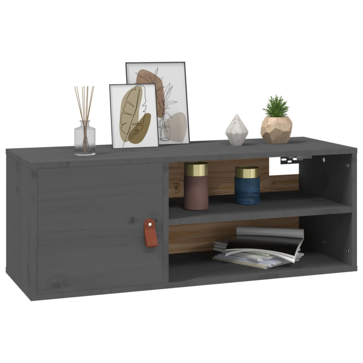 This wooden wall cabinet is a decorative and practical extension to your home decor. Solid pine wood: Solid pine wood is a beautiful natural material. Pine wood has a straight grain, and the knots give the material its signature, rustic look.Ample storage space: Featuring 4 compartments and 1 door, this wall shelf offers ample storage space for keeping your magazines, books, DVDs, multimedia devices, and other decorative items well organised and within reach.Wall-mounted design: The wall unit doesn't take any floor space. You can hang it on the wall easily. Note:Screw(s) and plug(s) for inside the wall are not included. Seek and use screw(s) and plug(s) suitable for your walls. If you are uncertain, seek professional advice. Read and follow each step of the instruction carefully.Each product comes with an assembly manual in the box for easy assembly.
