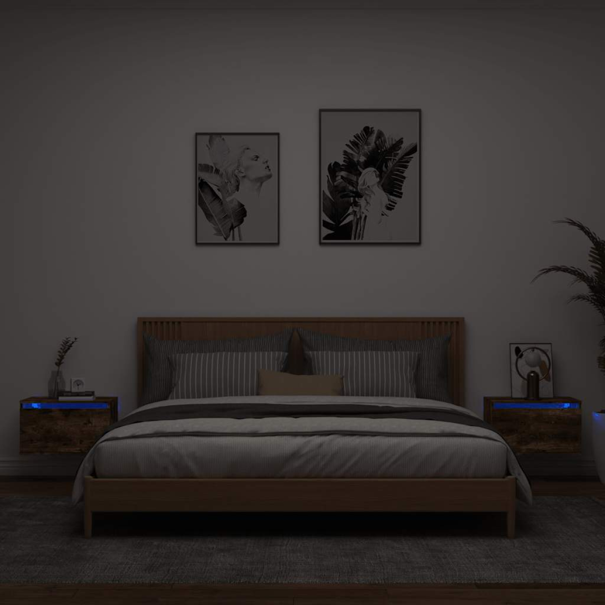 These wall-mounted bedside cabinets with LED lights are the perfect solution for your living space to maximise space and keep the floor areas clean. Durable material: The engineered wood is of exceptional quality with smooth surface and also features strength, stability and resistance to moisture. Made of engineered wood, the wall hung bedside cabinet is easy-to-clean.RGB LED lights: The floating bedside cabinet is equipped with vibrant RGB LED lights. With various customisable menus, you can effortlessly change the colour of the lights and even set them to adjust automatically. These LED lights not only enhance the contemporary look of the cabinet but also add to its trendy appeal.Wall-mounted design: This floating bedside unit can be wall-mounted to add extra storage space. That way, you can maximise your floor space and keep the area clean.Multifunctional cabinet: The bedside wall cabinet serves as the ideal place to put items such as books, collectables, ornaments, and more. It transforms an empty wall into a design feature. Good to know:Screws and plugs for inside the wall are not included. We advise to find and use screws and plugs suitable specifically for your walls. If you're not sure, you can consult with a professional. Please read and follow each step of the instructions.The product has a USB connector that requires a certified 5V USB power source (not included).