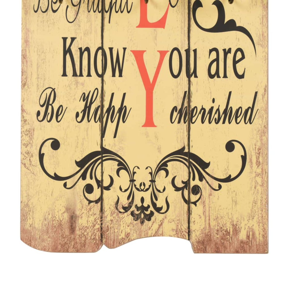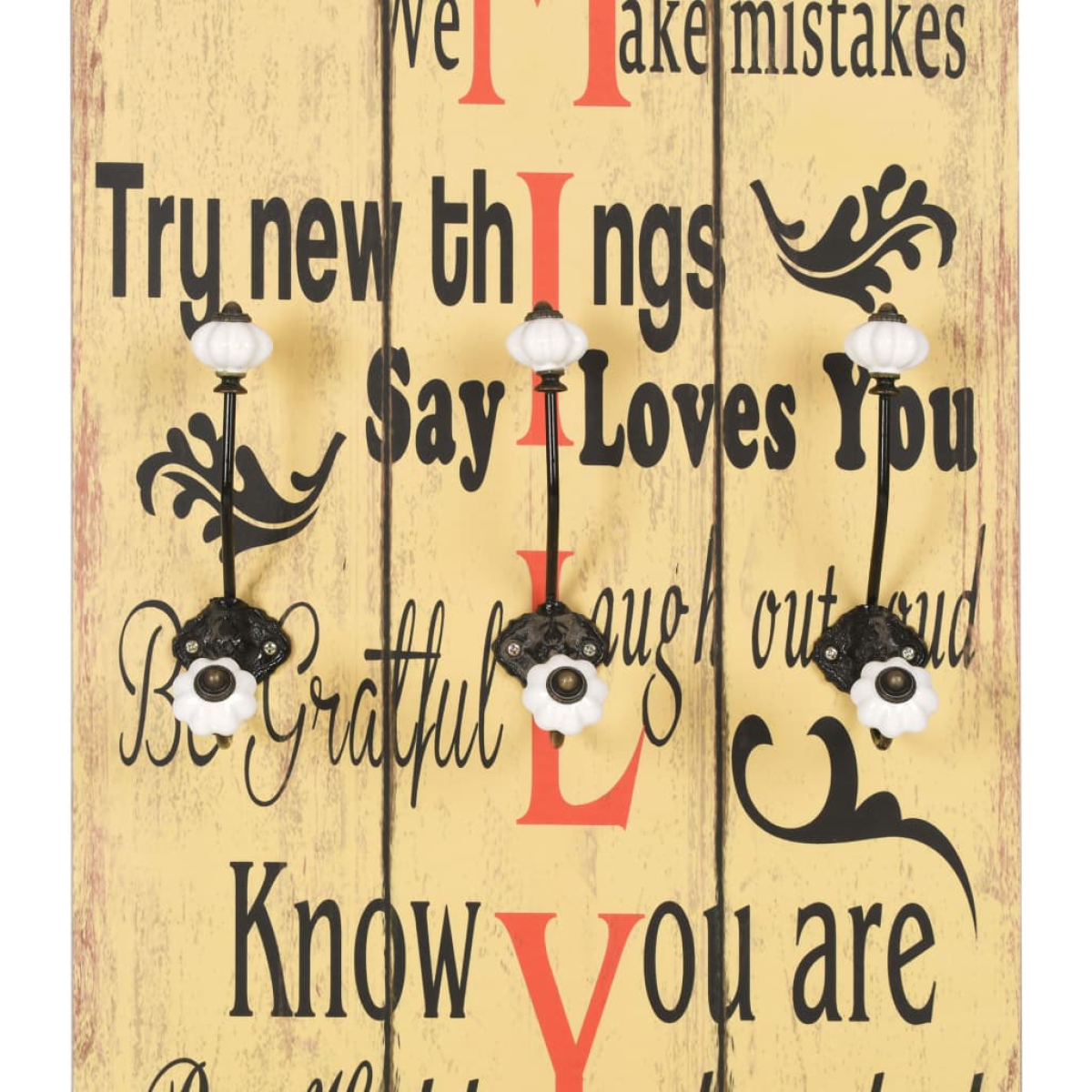 With its vintage-style print reading "Be thankful Always forgive Share Respect one another Show compassion We make mistakes Try new things Say I love you Be grateful Laugh out loud Know you are cherished Be happy", this wall-mounted coat rack with 6 hooks will become a real eye-catcher that your guests will immediately notice. The coat rack is made of MDF board, which is very sturdy. Designed with two rows of three exquisite metal hooks, the coat rack has ample space for your coats, bags, scarves, hats or other small items. With two attachment points on the back, the coat rack can be easily mounted onto the wall. The assembly is easy. Delivery also includes the required mounting materials.