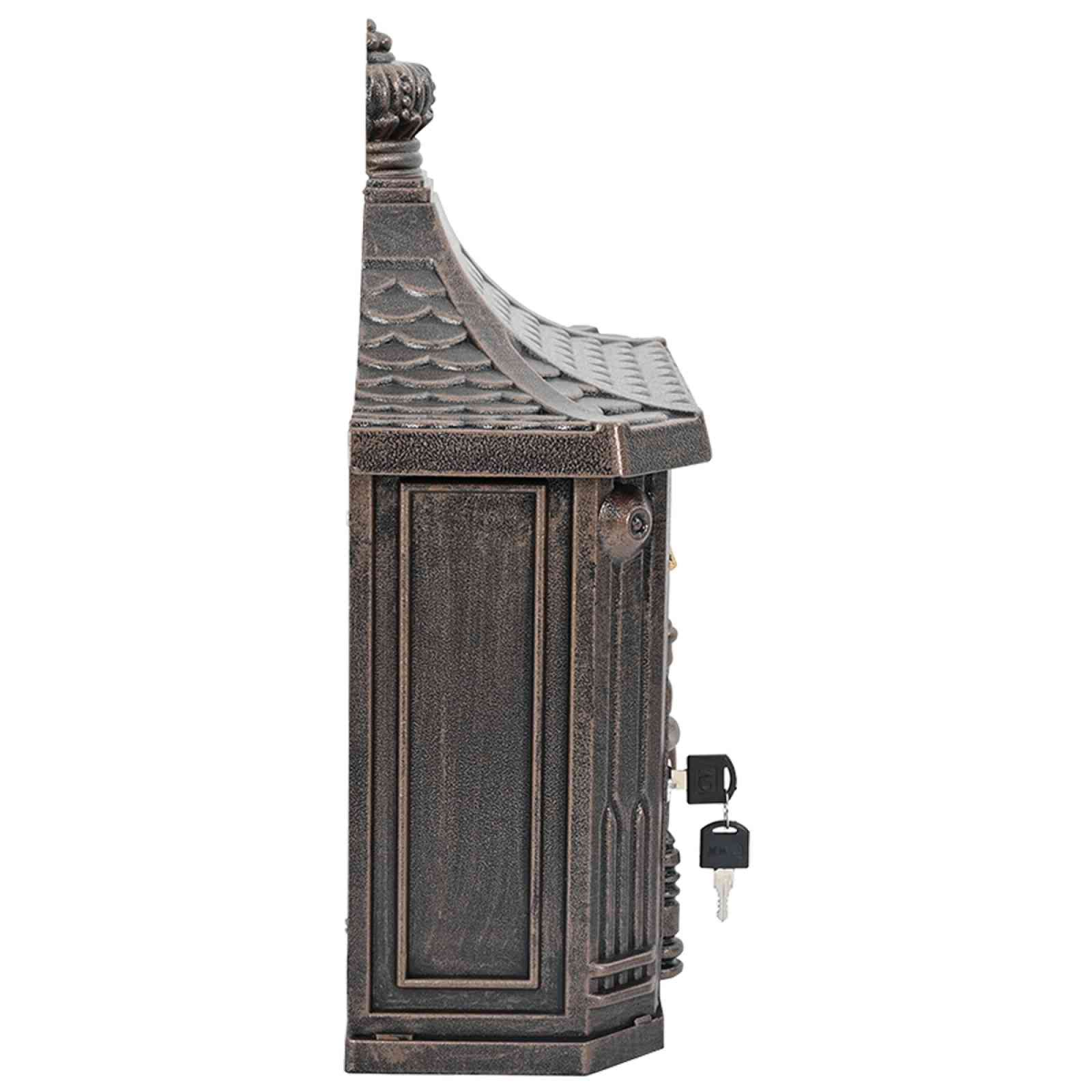This wall-mounted mailbox adds a touch of vintage charm to any outdoor space, combining both functionality and aesthetic appeal. Its classic design and robust construction make it an ideal choice for homeowners looking to enhance their garden or terrace with a stylish and secure mail receiving option. With its vintage flair, this mailbox instantly elevates the visual appeal of your home's exterior, making it a stand-out feature in your decorative ensemble. Cast Aluminum Structure The mailbox is crafted from sturdy cast aluminum, offering excellent resistance to and wear. Its robust construction withstands harsh weather conditions, ensuring longevity and reliability. This durable material ensures the mailbox maintains its sleek appearance and doesn’t compromise under outdoor elements. Functional Components This mailbox includes aluminum doors that provide easy access with a smooth open and close mechanism. Utilizing cam locks, it features secure mail storage, offering peace of mind about the safety of your received emails. These components collectively contribute to a streamlined and convenient mail collecting experience. Classic Vintage Style Inspired by past eras, this mailbox boasts a vintage design that seamlessly complements traditional and rustic outdoor décor. Its timeless elegance appeals to homeowners seeking to infuse character into their outdoor space. This statement piece provides both functional and aesthetic value. Outdoor Compatibility Designed for outdoor use purposes, the mailbox fits excellently into gardens, terraces, or front porch settings. Its weatherproof construction ensures that it can brave external environments, keeping functionality intact through various seasonal changes. This adaptability makes it a reliable and versatile addition. Simple Maintenance Maintaining the mailbox involves straightforward care. A gentle wipe with a damp cloth keeps its exterior pristine, removing dirt and ensuring a shiny finish. This easy maintenance extends the product's aesthetic appeal over time, maintaining its role as a decorative focal point.