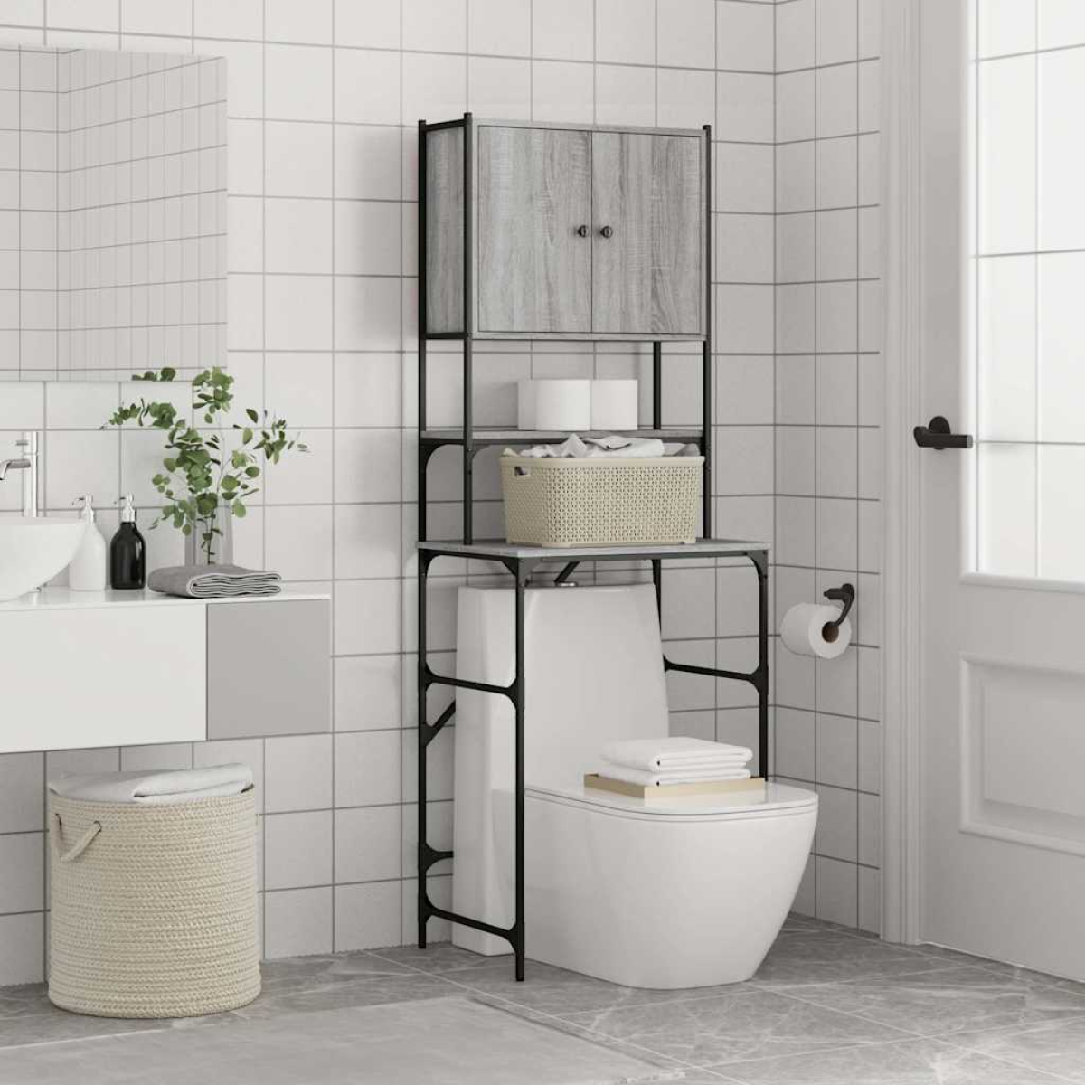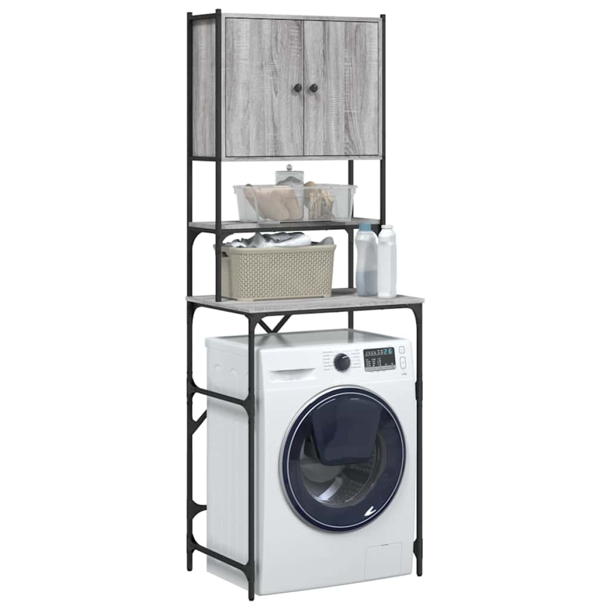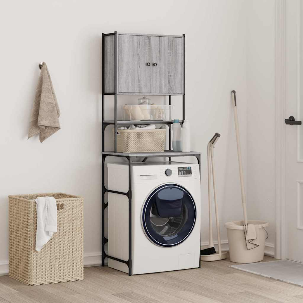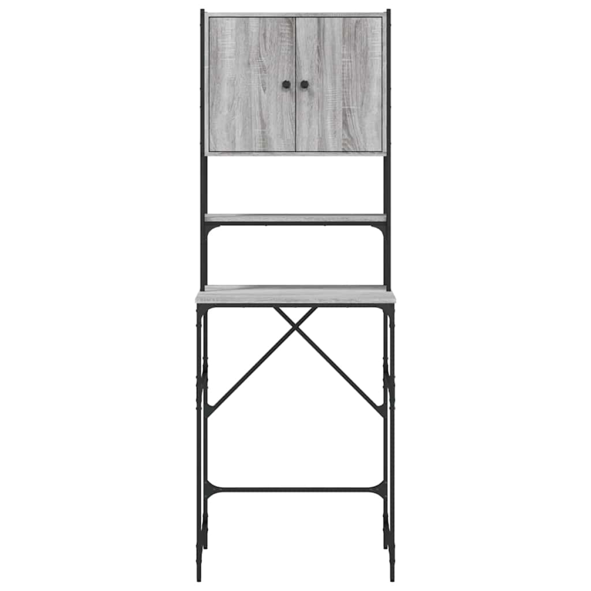 With this washing machine cabinet, you can create and optimally use additional storage space in the bathroom or laundry room. Durable material: The engineered wood is of exceptional quality with smooth surface and also features strength, stability and resistance to moisture. Made of engineered wood, the bathroom shelf is easy to clean.Ample storage space: The bathroom storage features 2 open shelves and 2 compartments under doors, offering ample space to easily hold your essential cleaning supplies such as soap, laundry detergent, fabric softener, and more.Space-saving design: The bathroom organiser is designed to be placed above the washing machine or toilet, fitting well in small spaces and making it ideal for small bathrooms and laundry rooms.Adjustable feet: The adjustable feet with plastic pads keep the toilet stand balanced on uneven ground and increase stability.Metal frame: The metal frame adds an industrial style to your interior while ensuring durability and stability. Warning:To prevent it being overturned, this product must be used with the provided wall attachment device. Good to know:Screws and plugs for inside the wall are not included. We advise to find and use screws and plugs suitable specifically for your walls. If you're not sure, you can consult with a professional. Please read and follow each step of the instructions.
