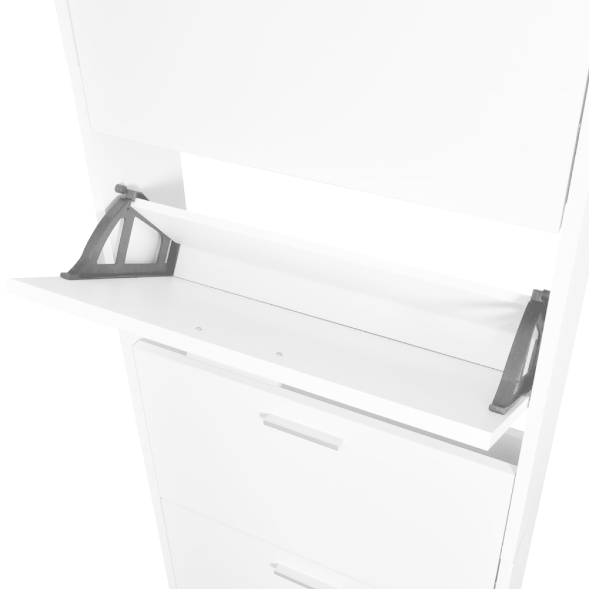 This wooden shoe cabinet has 5 storage compartments and a simple, yet stylish design. You will no longer be annoyed by shoes cluttering your floor. Up to 15 pairs of shoes can be stored dust-free in the 5 compartments. Made of high quality wood, our shoe cabinet is easy to assemble.