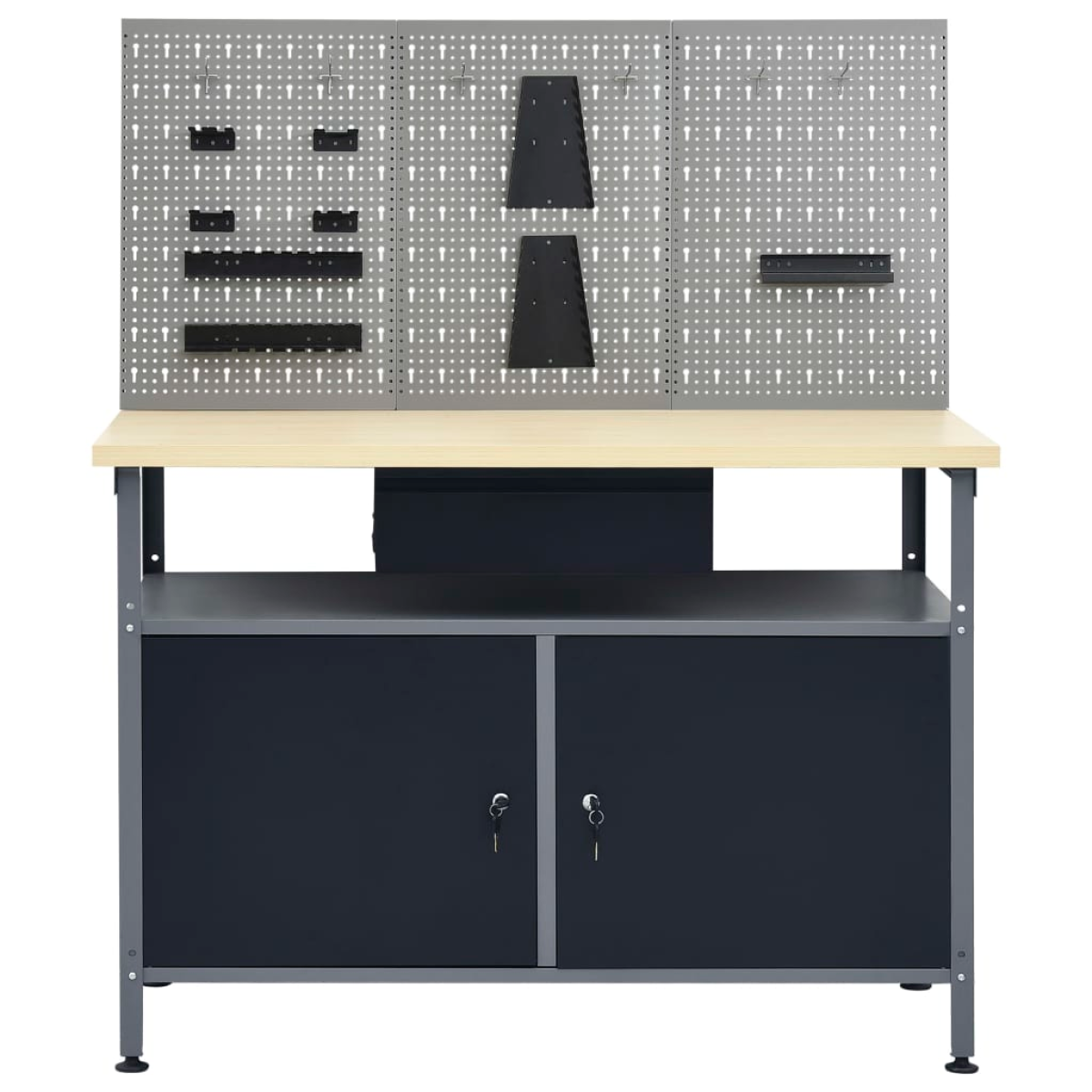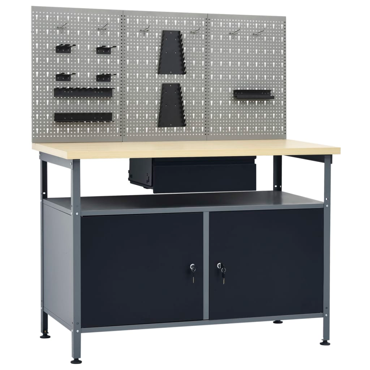 This set is combined with 1 workbench and 3 wall panels, and make a practical storage solution to your workshop and garage. The heavy-duty workbench, standing out with ample storage space and 300 kg loading capacity. This workbench has an open compartment equipped with a drawer, ensuring that you can organize your tools, parts and accessories such as screws, nails and adhesive tape well. . There are 2 shelves and a large compartment with 2 lockable doors, to easily accommodate drills, cable drums and grinders. Additionally, the feet are height-adjustable. This workstation is crafted from premium steel and engineered wood, making it extra sturdy, durable and easy to clean. It is easy to assemble. These tool panels are crafted from solid steel to bear the weight of various tools, like drills, pliers, screwdrivers and wrenches. These panels are perforated for fixing tools easily and securely. The 3 wall panels can be fixed together for extra rigidity. It is an ideal addition to your workbench and workshop cabinets with a practical width of 120 cm.