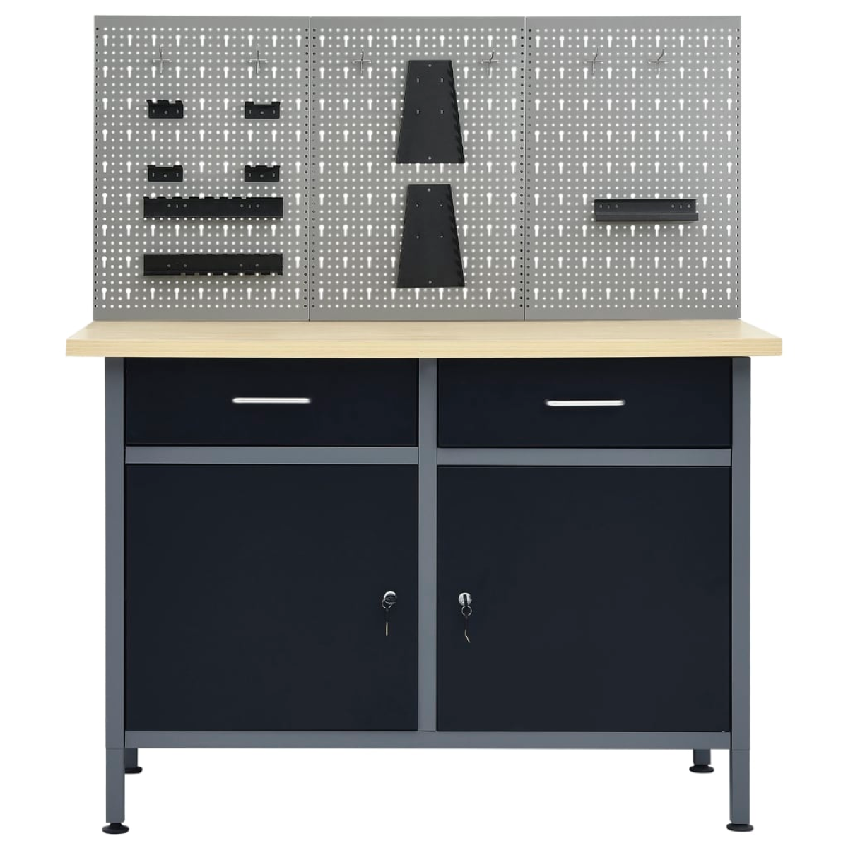 This set is combined with 1 workbench and 3 wall panels, and make a practical storage solution to your workshop and garage. The heavy-duty workbench, standing out with ample storage space and 500 kg loading capacity. This workbench has 2 drawers, ensuring that you can organize your tools, parts and accessories such as screws, nails and adhesive tape well. The drawers are equipped with ball bearing mechanism for smooth sliding. There are 2 shelves and a large compartment with 2 lockable doors, to easily accommodate drills, cable drums and grinders. Additionally, the feet are height-adjustable. This workstation is crafted from premium steel and engineered wood, making it extra sturdy, durable and easy to clean. It is easy to assemble. These tool panels are crafted from solid steel to bear the weight of various tools, like drills, pliers, screwdrivers and wrenches. These panels are perforated for fixing tools easily and securely. The 3 wall panels can be fixed together for extra rigidity. It is an ideal addition to your workbench and workshop cabinets with a practical width of 120 cm.
