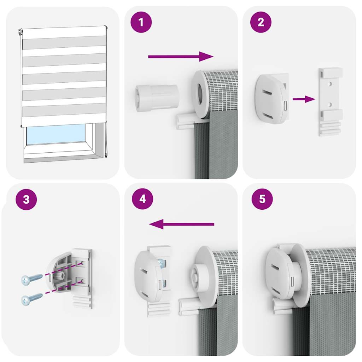 Elevate your room's style and functionality with this zebra roller blind, offering privacy and elegance. Durable and low maintenance: Made from 100% polyester, the zebra blind is built to last and resist wear and tear. They are also easy to clean, typically requiring light dusting or wiping with a damp cloth.Privacy and sun protection: The two-layer design features alternating transparent and opaque fabric panels. The light can be easily controlled using the chain hoist, allowing for seamless adjustment of the room's lighting from translucent to fully darkened.Two assembly ways: You can attach the zebra roller blind to the wall or window with screws or without drilling using clamping brackets, depending on your needs.Elegant design: Thanks to its sleek and modern pattern design, this zebra roller blind effortlessly complements a variety of room decor. You can use it in the living room, bedroom, office, and so on.Child safety and adjustability: The roller blind includes a chain connector that makes it easy to adjust the height according to your needs, and it also has a cord clip to add child safety. Warning:Keep cords out of the reach of young children. Cords may become wrapped around a child’s neck. Good to know:Before buying blinds, start by measuring your window glass. Just a friendly tip: the fabric is a bit narrower than the total width, including the brackets.To make sure your new blinds provide complete coverage, just add 4,1 cm to the width of the window glass when calculating what to order.