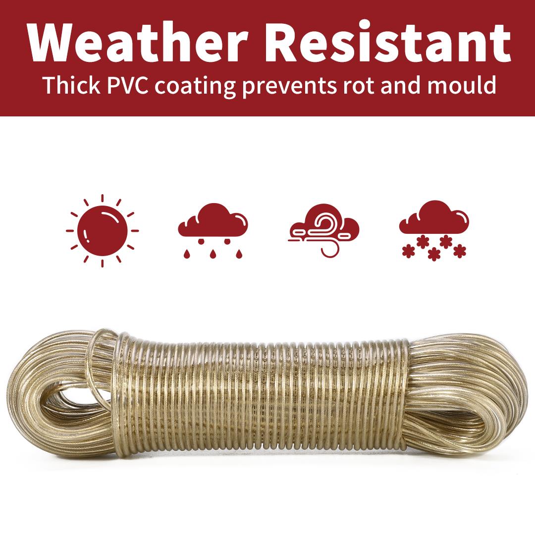 STRONG STEEL CLOTHESLINE: Made with a strong steel core and strong PVC that can hold up to 200kg of pulling force. Sag resistant and designed to stand the test of time.