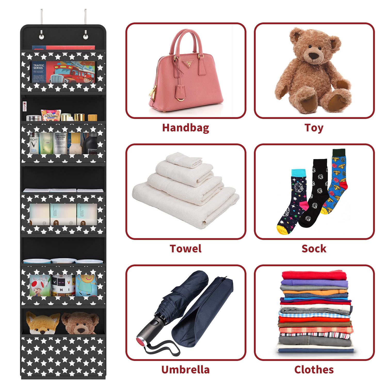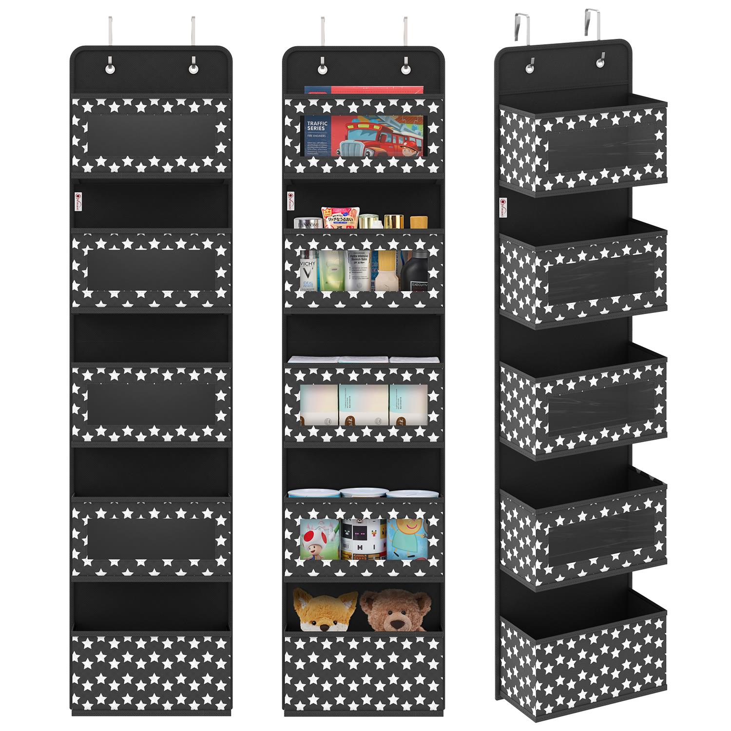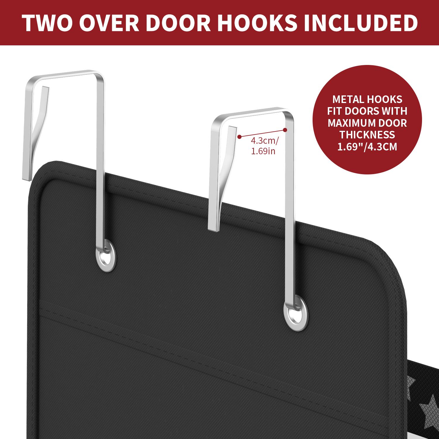 SPACE SAVING ESSENTIAL: No more room for your stuff? Make use of your door or closet door with this vertical organiser to save floor space, tidy up, keep things easily accessible, and reduce clutter. All of your essential items can be neatly stored in multiple compartments without taking up a lot of room in your luggage. COMFORT & EASE OF ACCESS: Organising your essentials has never been easier! Each of your items is plainly ordered and visible in this hanging organizer bag with clear windows, ensuring that you'll able to locate your stuff in seconds rather than digging personal items through a jumble. EASY INSTALLATION: Simply stuff the cardboard plates into each pocket and hook it to the door to create vertical storage space. This set includes two metal hooks, side and base plates for the bottom of all pockets to give them a strong enough shape and to aid in the storage of items. Over the door hanging storage can be hung not only on doors and shelves, but also on the wall with nails or through the wear-resistant holes in the hooks. MULTI-USE: This hanging organiser is excellent for organising and storing a variety of goods such as cosmetics, toiletries, socks, diapers, baby wipes, underwear, scarves, hats, towels, toys, and electronic charging cords. When not in use, simply remove the hooks and boards and fold it flat to save you space! PREMIUM QUALITY: High-quality non-woven eco-friendly fabric that are durable, washable, waterproof, moisture-proof and dustproof. Each measure 12 x 31 x 126 cm (4.7 x 12.2 x 49.6in). Available in 2 colors and tiers: Black & Grey - 4 Tier & 5 Tiers.