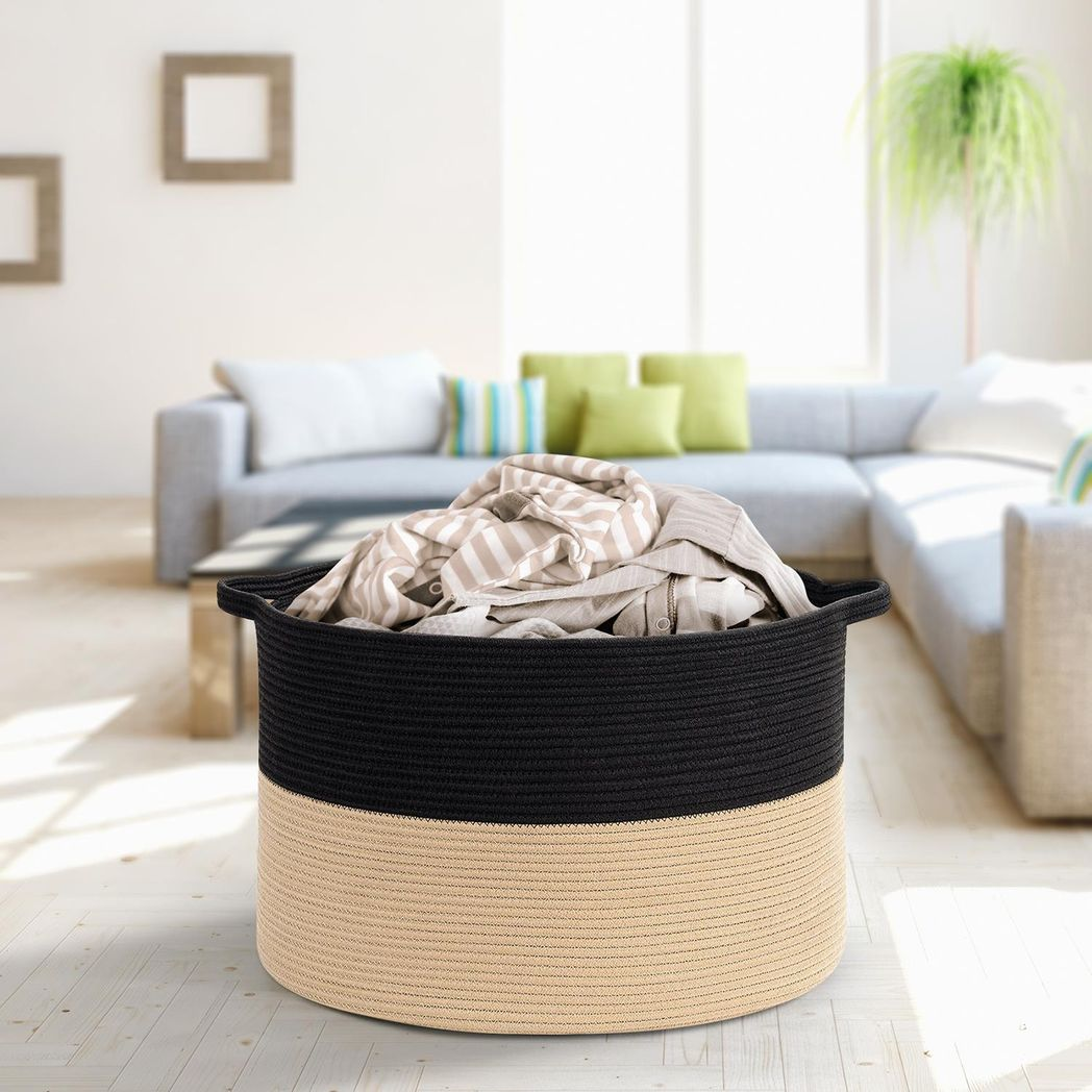 NATURAL HAND-WOVEN BASKET: This hand-woven eco-friendly cotton rope has natural, renewable material that are free of harsh chemicals and harmful additives, making it safe for children and pets. The 56 x 35.5cm (21.6 x 15.7 in) rope basket hamper is best suited for dealing with overflowing garments and toy piles. A fine collection of rope storage baskets to keep your home looking nice and your stuff tucked away!