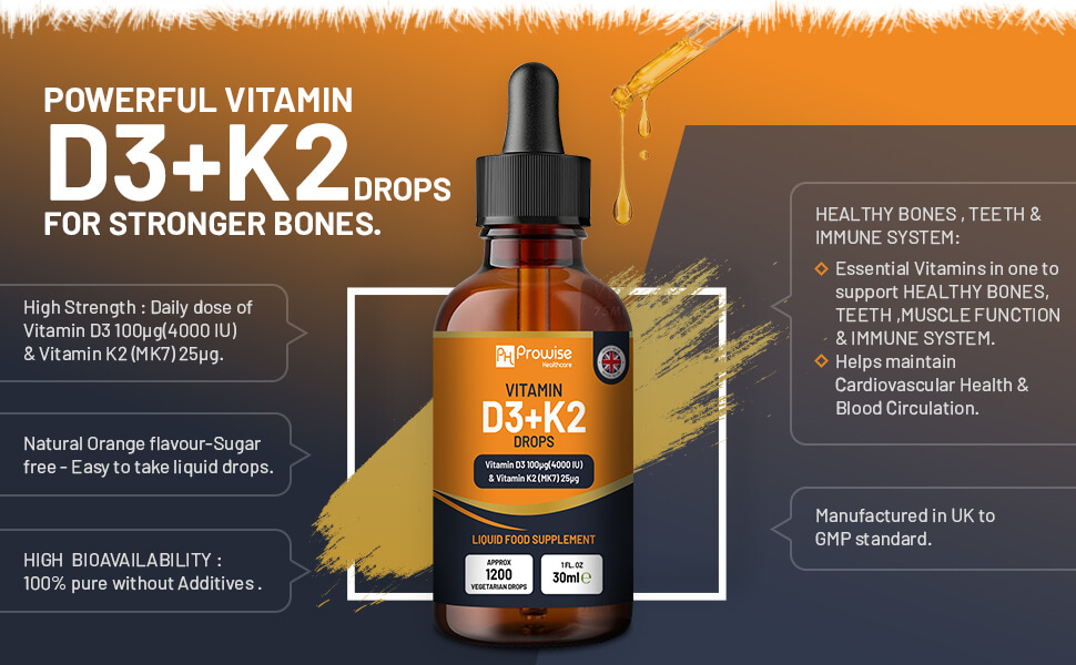 • WHY BUY PROWISE D34000 IU & Vitamin K2 100ug Orange Drops ? - Vitamin D3 & K2 work really well with each other. As both Vitamins are natural partners while Vitamin D helps with a boosted immune system and overall better health, added Vitamin K which actually works to boost the absorption of Vitamin D in the body for better results.
