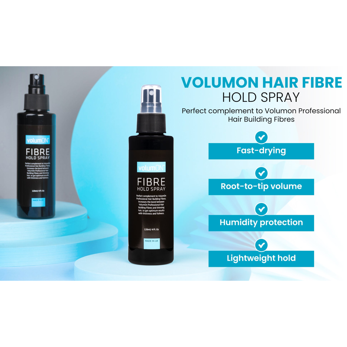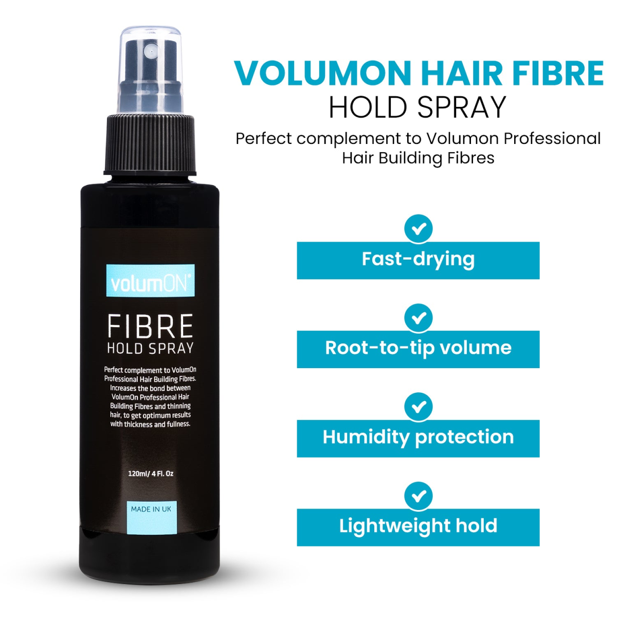 Perfect complement to Volumon Professional Hair Building Fibres. Increases the bond between Volumon Professional Hair Building Fibres and thinning hair, to get optimum results with thickness and fullness.