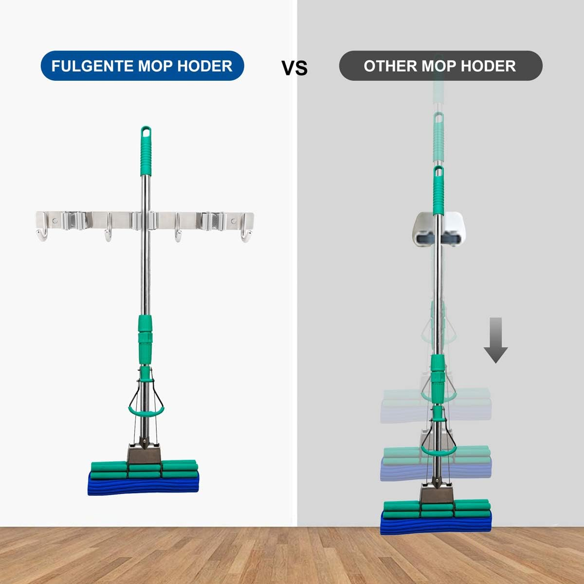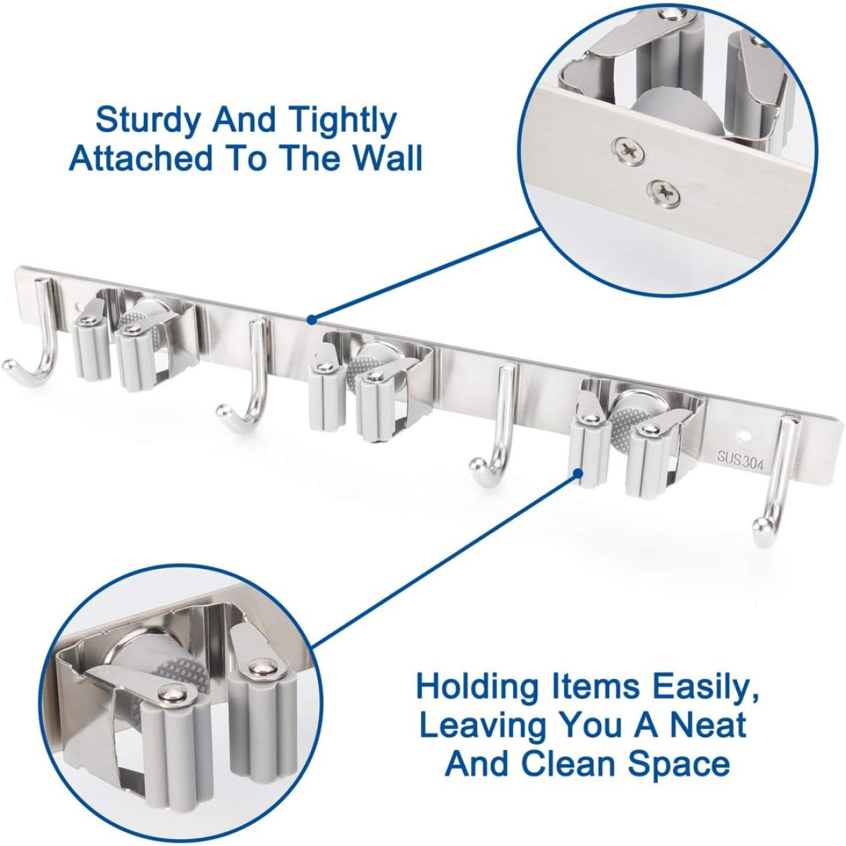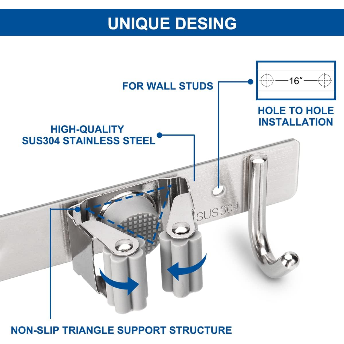 - Durable Material: This mop broom holder wall mounted is made of 304 stainless steel. Waterproof, corrosion resistance, strong and durable than aluminium and plastic broom holder. Design with corrugated rubber anti-skid roller teeth and stainless steel triangle fixed clip, it's better to prevent object slipping and provide good heavy duty.