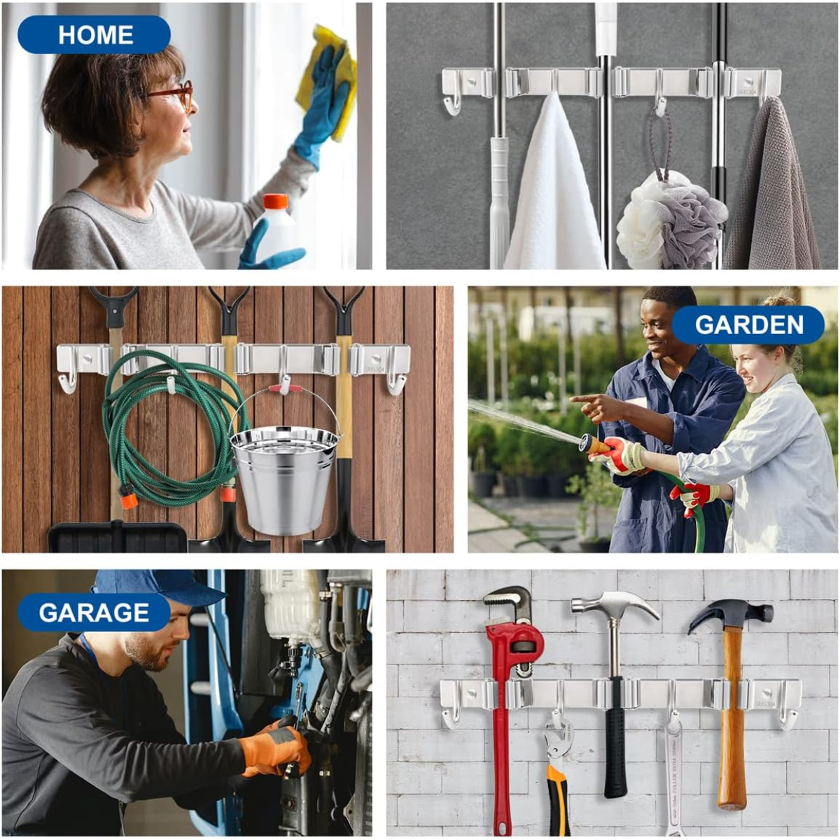 FULGENTE Broom Mop Holder Wall Mount Stainless Steel Tool Hanger Organizer for Home, Kitchen, Garden, Garage, Landry, Bathroom Organization and storage, 3 Racks 4 Hooks Gray
