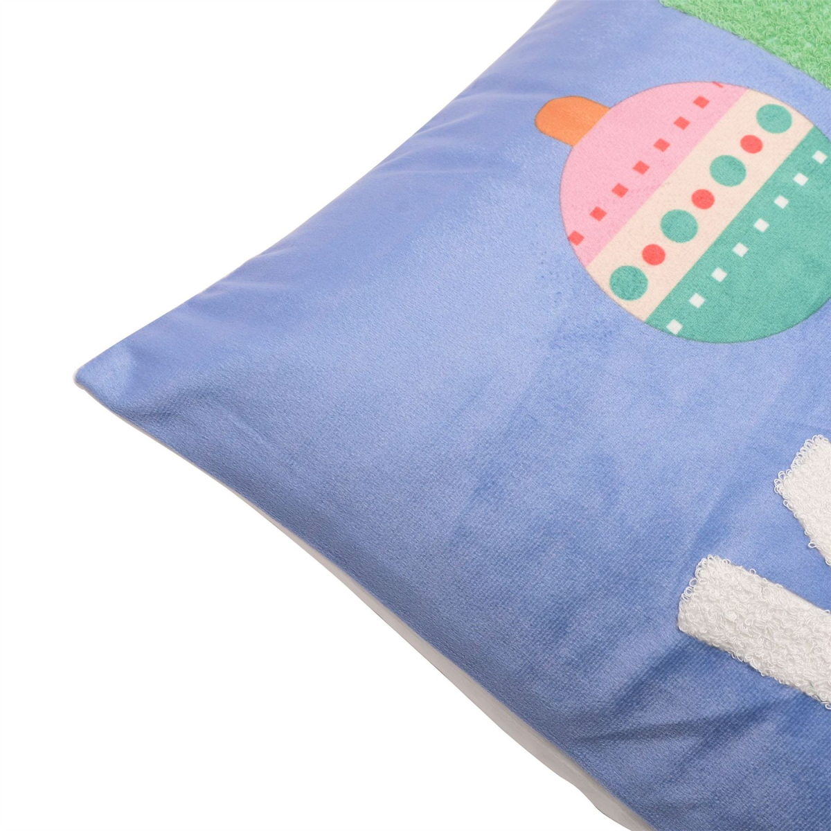 The cotton cushion showcases gorgeous light blue colouring to one side and is finished with an embroidered, multi-coloured �Oh What Fun� title. The letter �O� is replaced by a printed bauble design.