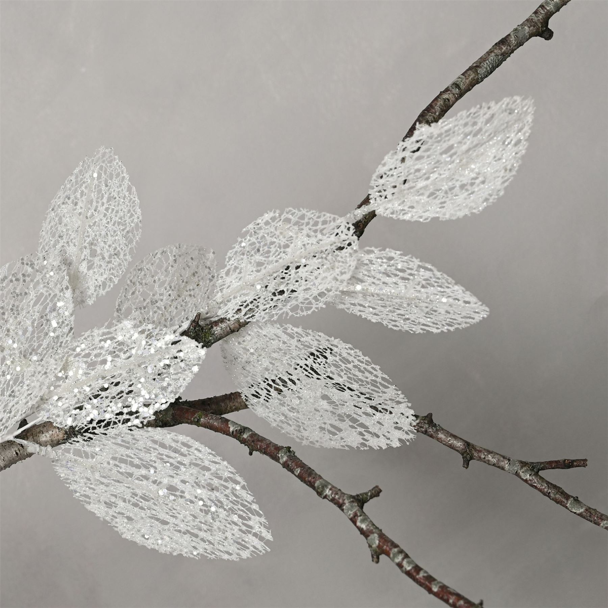 The artificial white stem showcases a vivid frosted effect finish throughout, complete with glitter embellishments. It is designed for vase display.