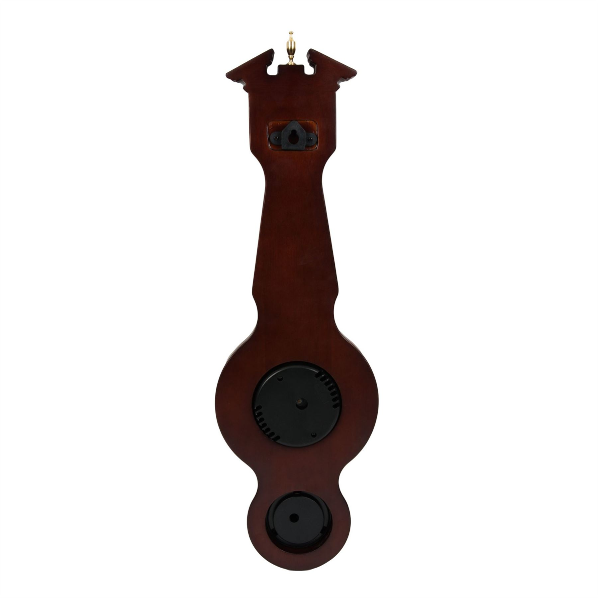 The matt, mahogany finish of this weather station is enhanced by its intricate carved eave design. Below the thermometer sits both an accurate barometer and hygrometer gauge, each surrounded by a gold metal bezel.