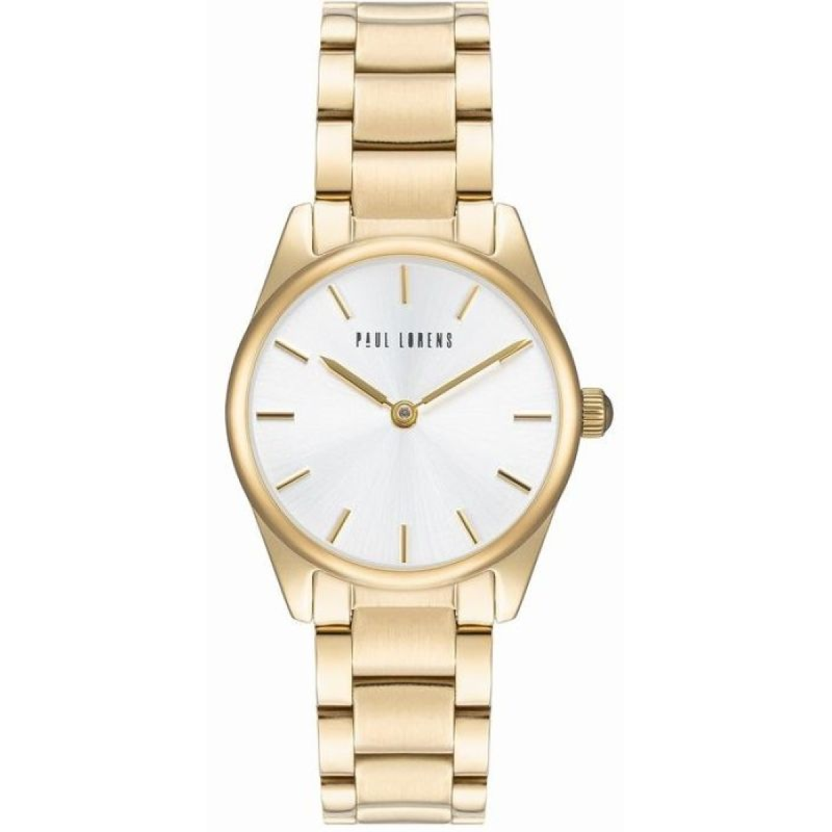 Its smooth, subtly shimmering surface harmoniously wraps the wrist, ensuring all-day comfort. Its precise contouring perfectly fits a woman's hand, subtly accentuating the wrist's slenderness and adding a touch of elegance to any outfit. Stainless steel combines both durability and lightness, making the watch exceptionally comfortable to wear. The bracelet's design perfectly balances luxury with everyday simplicity, making this watch ideal for both evening wear and everyday wear. The Paul Lorens logo on the bracelet clasp completes the look.