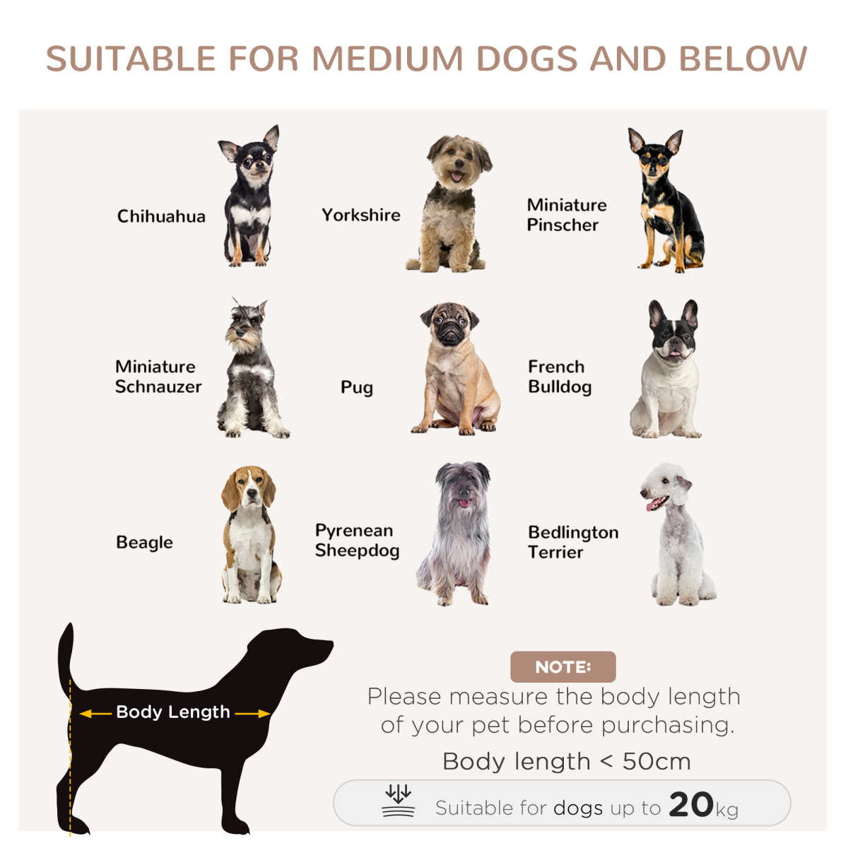 Multifunctional: Can be used as a dog crate and side table. Pets have a secure spot to relax, whilst you have space to display your favourite pieces.Easy access: Double doors for pets to get in and out. Doors can be locked, keeping pets securely inside the dog cage.Wooden structure: Made from pine wood, it's a strong and durable wood dog crate - suitable for daily use. Spaced bars, keeping their area ventilated and lets you see your pet.Cushioned inside: Placed on the bottom, making this wooden dog crate extra cosy. The cushion is washable, so their space stays clean and comfortable.Dimensions: 72H x 82.5W x 57Dcm. Inside cage: 60H x 76W x 51Dcm. Double door(Single): 53.5H x 35.5Wcm. Cushion: 76.5L x 52W x 5Dcm. Suitable for medium dogs up to 20 kg, 50 cm in body length.
