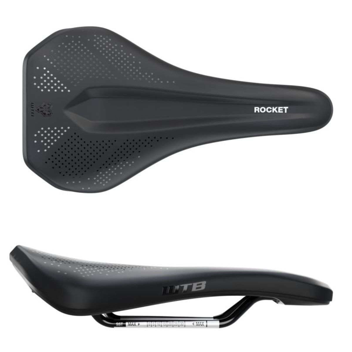 The WTB Rocket mountain bike saddle is designed for both performance and comfort, with a sleek profile that adapts to an aggressive riding style. It features a small, discreet handle integrated under the saddle, making it easy to lift and maneuver a heavy bike over obstacles or during hiking or loading sections. With durable padding and an ergonomic shape, the Rocket saddle provides comfort on long rides.