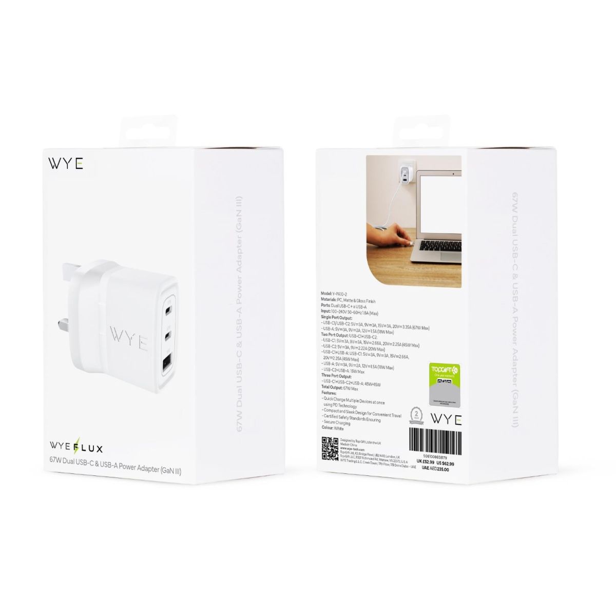 WYEFLUX 67W Dual USB Type C & USB-A Power Adapter (GaN III)