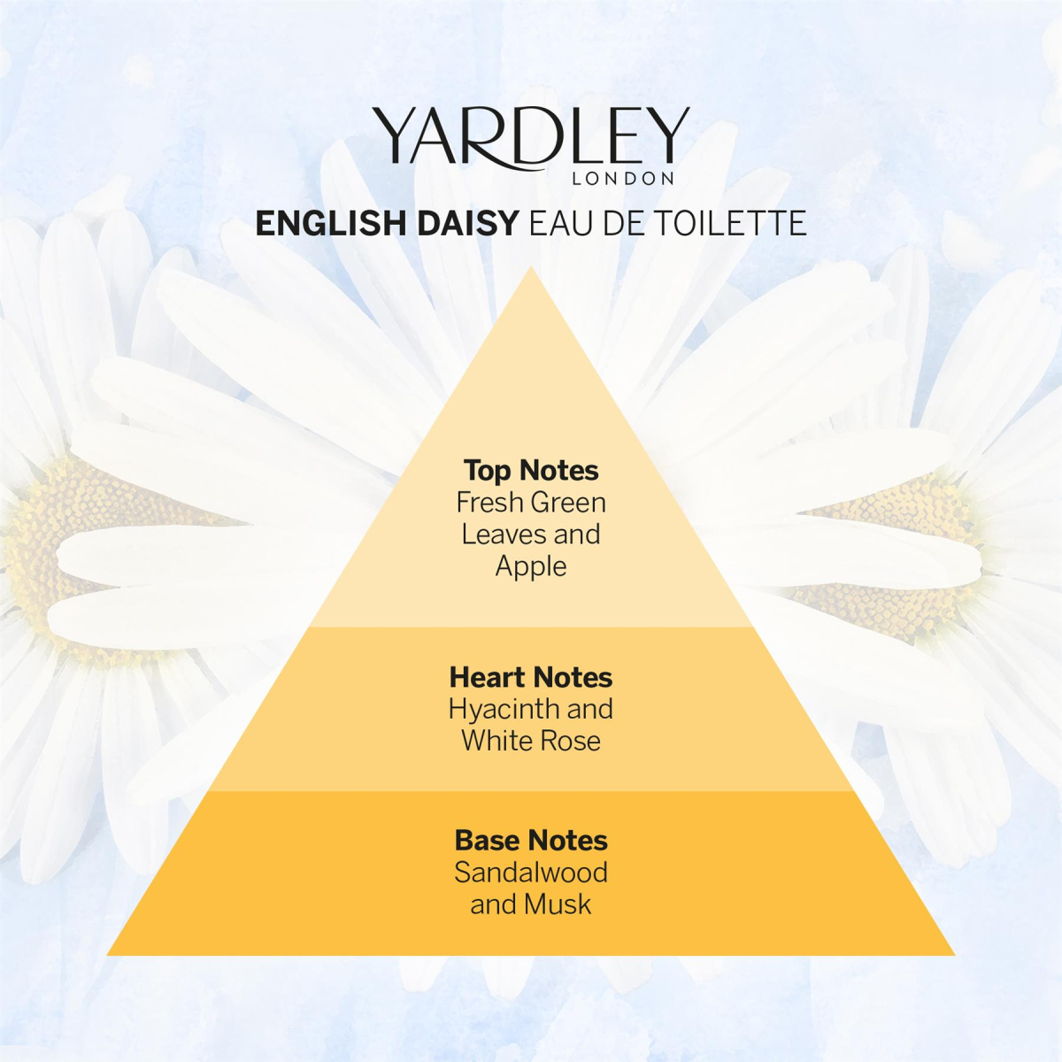 Yardley's English Daisy perfume is inspired by bountiful, beautiful and blossoming floral bouquets. An elegant, dewy fresh green floral inspired by the vibrancy of the daisy flower, with a burst of energetic top note of fresh green leaves and apple and a combination of hyacinth and white rose at its heart, drying down to warm base notes of sandalwood and musk.
