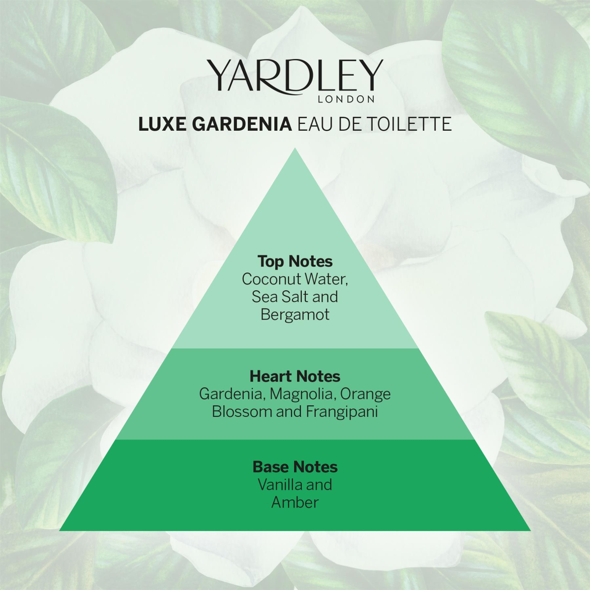 Yardley's Luxe Gardenia is a perfume inspired by bountiful, beautiful and blossoming floral bouquets. Opening with uplifting bergamot and a sprinkle of sea salt and coconut water, this modern luxurious floral fragrance exudes a heart of rich white flowers combining gardenia, magnolia, orange blossom and frangipani, all wrapped up in a comforting amber and vanilla base.