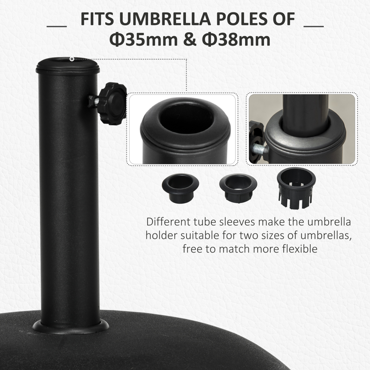 This circular umbrella base is a great compliment to your Parasol and garden furniture. Made of high quality steel and cement it us able to accommodate different pole sizes of 34mm, 38mm diameters. It is suitable to be used in any patio, garden and any outdoor living spaces.