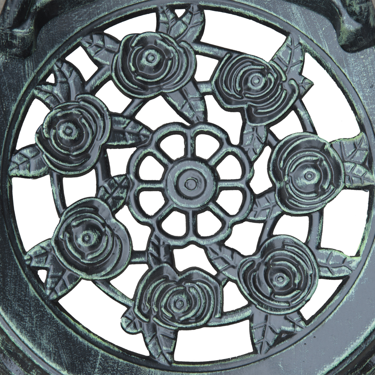 This bistro set will be a great addition to any patio area with its elegantly antique design. It is made from sturdy rust free cast aluminum and molded into an antique green look. The legs of the table and two chairs are made of sturdy iron, which provides a stable place to rest. Whether in your backyard, patio, deck or even your restaurant outdoor dining space, you'll enjoy these chairs for years to come.