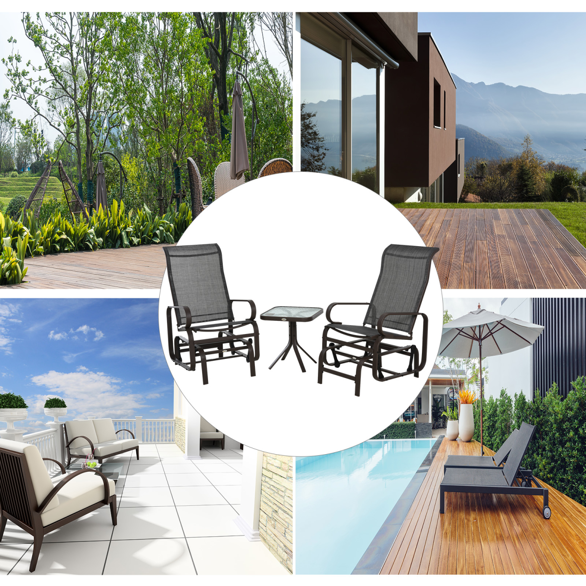 Outsunny 3PCS of Swing Chair with Tea Table Set with high quality iron pipe and textilene in exquisite workmanship is perfect for outdoor patio, park, yard, poolside and garden. Rocking with comfortable seat is beneficial for efficient relaxation. The lightweight construction makes it especially easy to move about from place to place. Two rocking chairs and a tea table suit, you can enjoy outdoor time with friends.