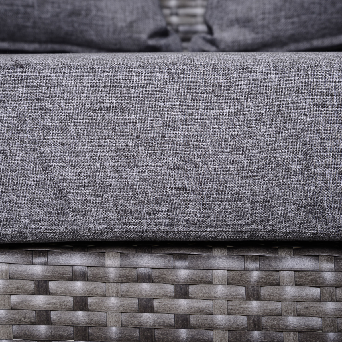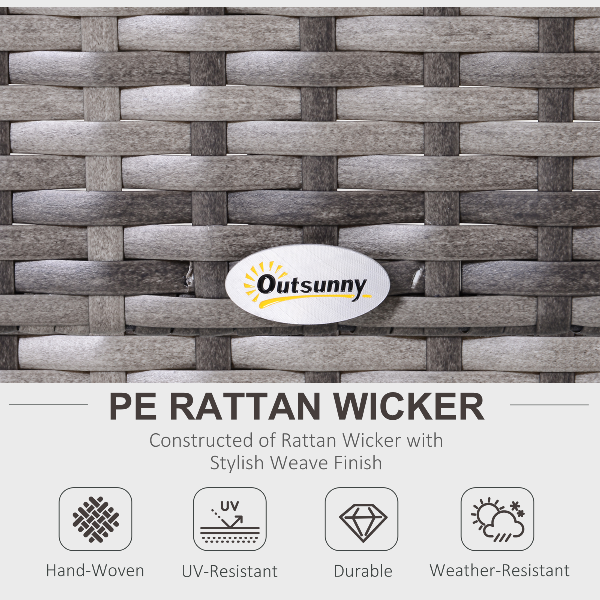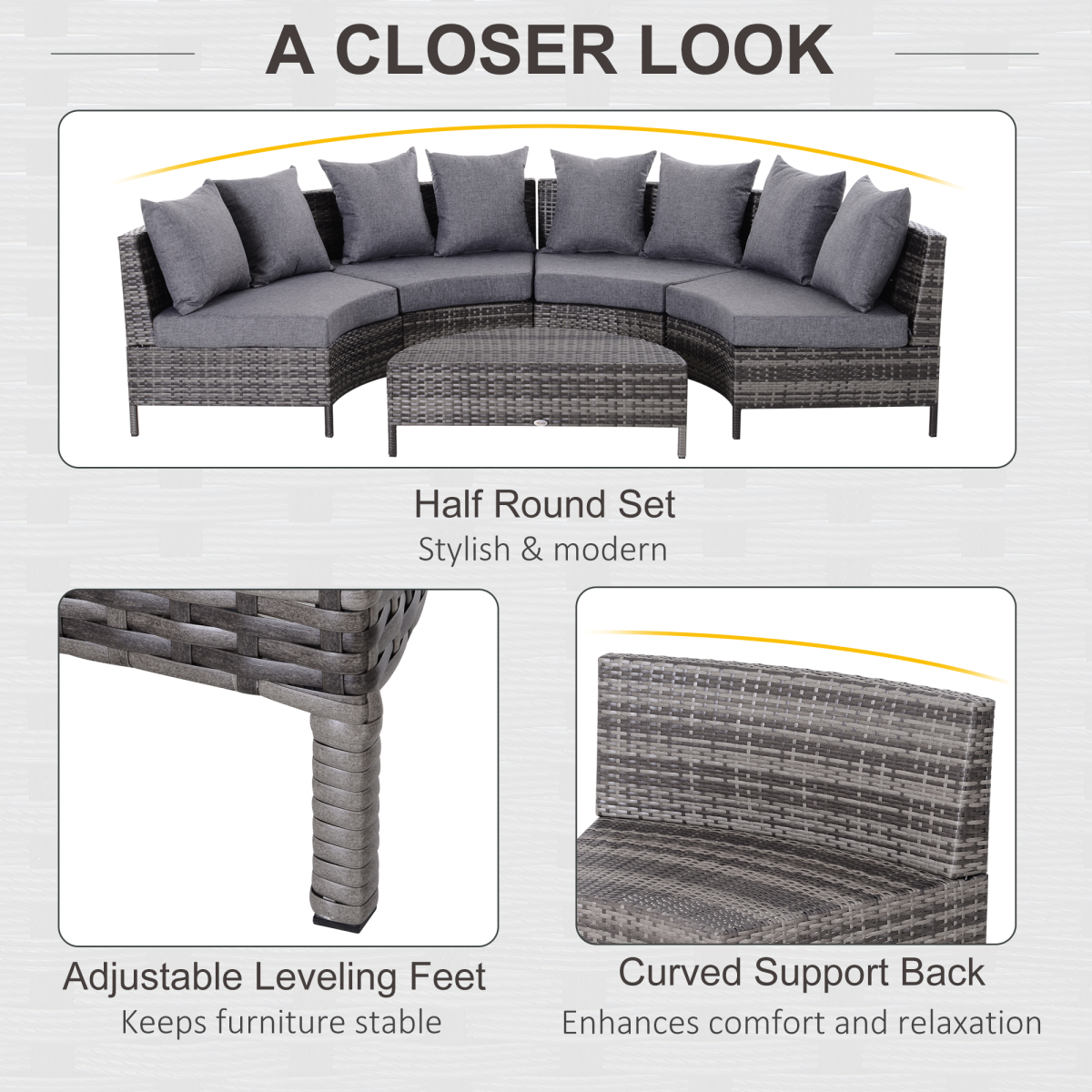 4-Seater Half Moon Shaped Rattan Outdoor Garden Furniture Set Grey" Description: "Makes those special times spent with friends in your garden better than ever before, thanks to this five-piece outdoor seating set from Outsunny. Using hand-woven PE rattan, in a stand-out mixed grey design, each piece has been made to withstand everyday use in all seasons, with a powder coated steel frame underneath for extra strength and support. Curved in shape for a more intimate and cosy feeling, each seat is fitted with a thick foam seat cushion with a washable cover to ensure you can lounge comfortably, with back cushions to support. It's finished with legs for balance and a matching coffee table for storage. Effortless style whilst you sit under the sun. Features: - Five-piece set, consisting of four chairs in a semi-circle sofa design and a matching table - Powder coated steel frame for strength, wrapped in UV and water-resistant rattan in a stylish mixed-grey finish - Thick, foam padded seat cushions for enduring comfort as you sit and relax, with removable and washable covers - Eight matching throw cushions included - Matching semi-circle table for keeping anything you need close to you - Legs ensure balance whilst protecting the floor below - Maximum weight whole sofa: 160kg, table: 30kg. Assembly required
