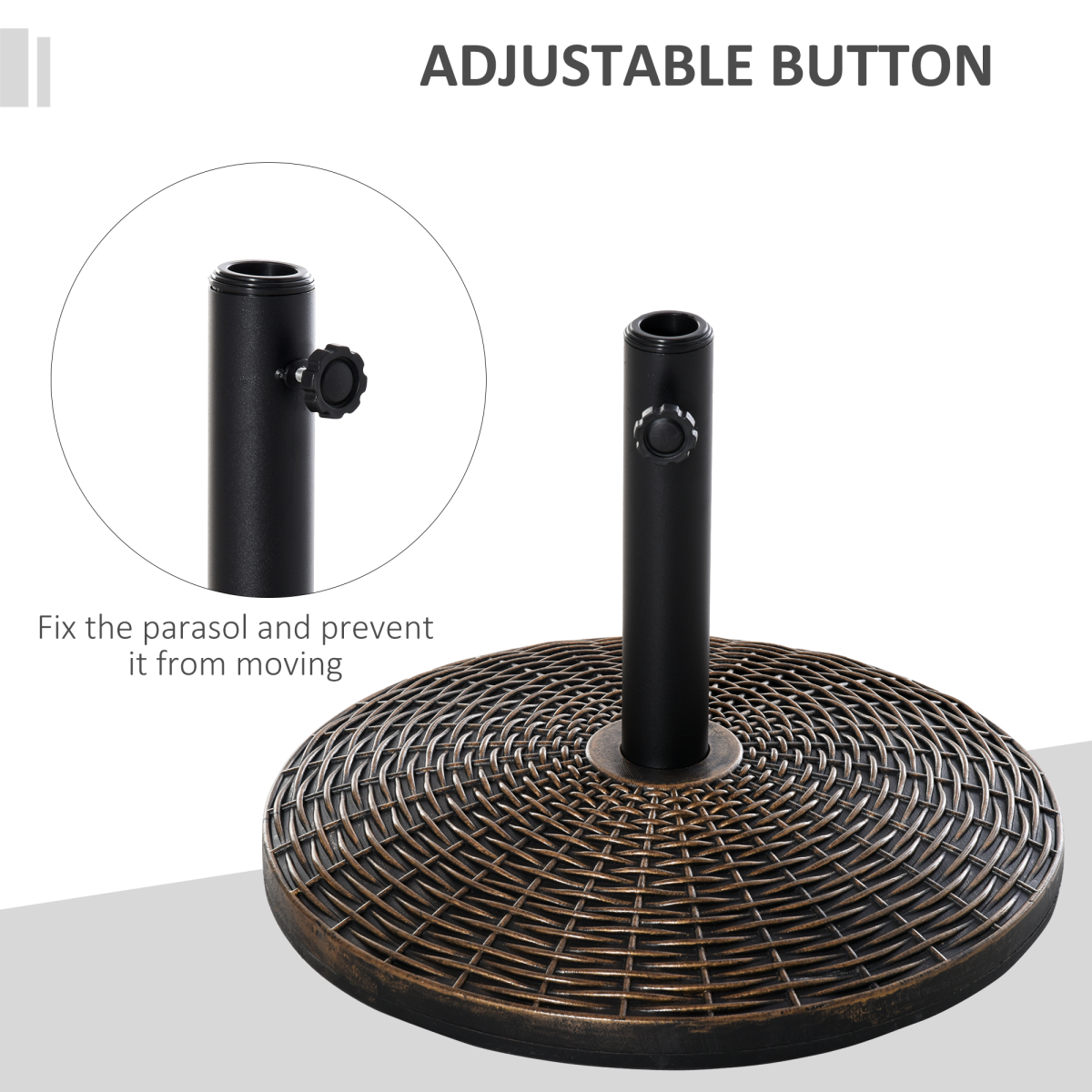 Ensure your parasol is kept firmly in place in all weather conditions with this umbrella base from Outsunny. Made from a combination of HDPE, cement and metal and crafted into a bronze effect rattan finish, it weighs 25kg, meaning it can withstand windy conditions. It is finished with a tightening screw and fits poles up to 48mm in diameter, allowing it to hold the pole securely in place. Strong, stylish and durable, it has been built to let you enjoy the sun with plenty of shade for years to come.